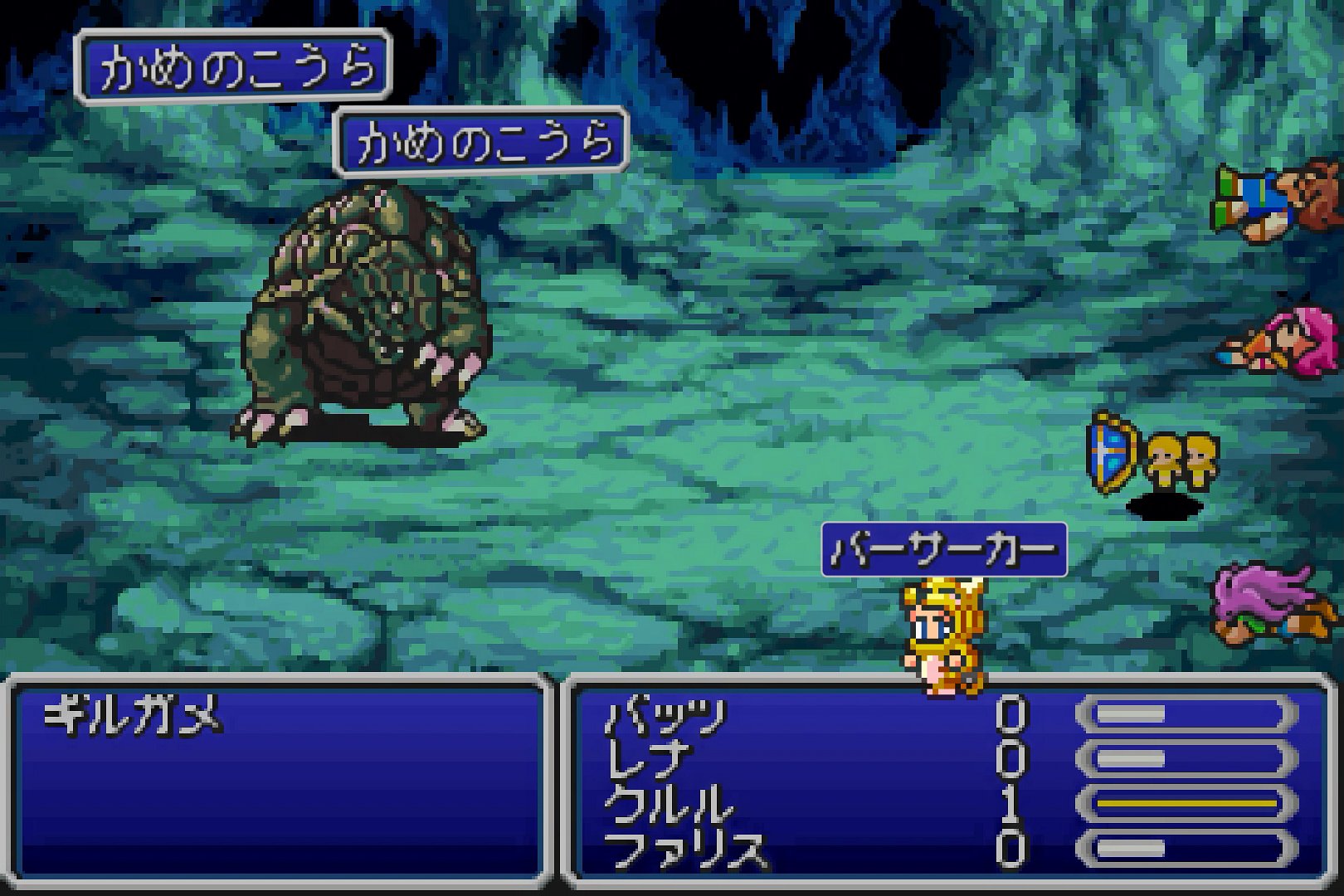 ということで。やる前から展開の分かっていたバトルであったが、実際に戦ってみたところ、狙いが全てハマって、ギルガメに対して、完全勝利を決めることができた。やり直しをしたのは、ややこしさを回避するため、”クルルを後列から前列に変更した”という、ただ一度だけである(賢者の杖は魔法攻撃武器のため、後列でも威力は半減しない。しかし、小人状態だと、素手でボカボカ殴っているモーションになる。そのような見た目のややこしさを回避するために、クルルを後列→前列へと変更した)。ギルガメは、Lv1バーサーカーひとりで、余裕で勝てる相手だったのである。