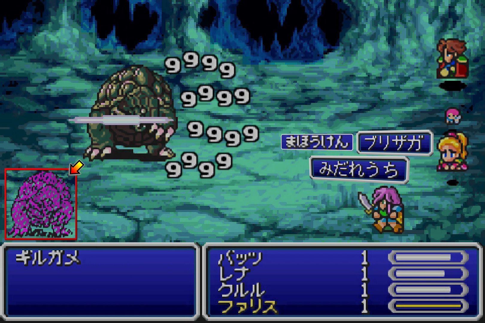 さて。戦法としては、あらかじめ全員を瀕死としたうえで、レナがナイト(ジョブコマンド「まもり」に加えて、ジョブ特性として「かばう」を内蔵)となって、刀装備で「まさむね」を持って初手を取り、「まもり+かばう」で防御を固める。そして、他のキャラが、「ちょうごう:ドラゴンパワー」で、ファリスに一気にレベルドーピングを行う。そして、レベル値が99となったら、「みだれうち」を使えば、9999×4が出て、ギルガメを撃破可能だ。