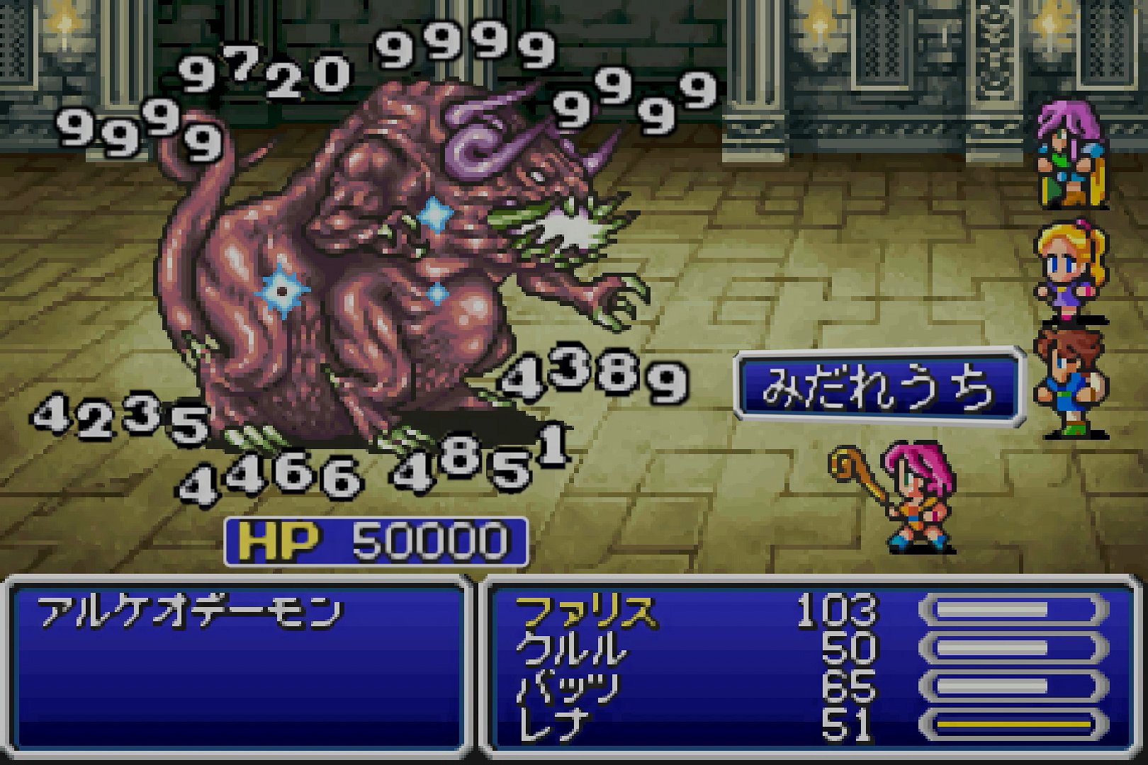 …というわけで。「みだれうち」を使う攻撃役として、まずファリスは選外となった(後述)ため、残ったキャラのうちから、魔力が最も高いレナに、アタッカーを任せることにした。レナの装備を整えたところ、その魔力は「74」という、ちょっと驚きの値に達した。これにより、ドーピングでレベル値が「81」(後述)に達したレナの魔法倍率は「27」となり、敵の魔法防御力は「0」であるため、威力「360」での与ダメージは9720〜10935ということになる(1万以上のダメージは9999となる)。カンストか、それに準ずるダメージを与えられるということで、火力としては十分すぎるものだろう。