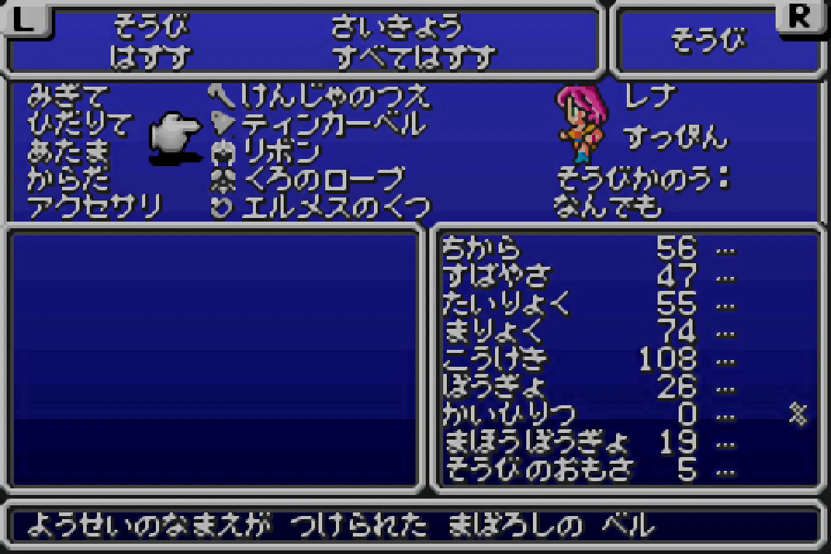 …こちらの「ティンカーベル」についても、賢者の杖と同じく魔法攻撃武器であり、「みだれうち」による半減補正を受けない。武器の攻撃力は「55」であるが、チキンナイフと同じように、「素早さと魔力の値を足して、2で割らない」という程度のダメージ計算式を持つ。しかも、他バージョンでは、攻撃力の変動値が50〜100%となっているところ、GBA版では100〜150%となっている。アドバンス版限定で、1.67倍もの超絶強化が為されているのだ。