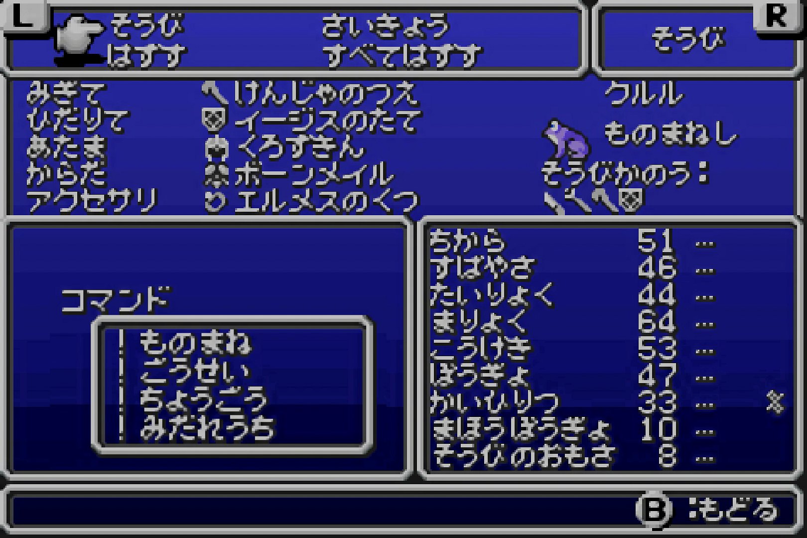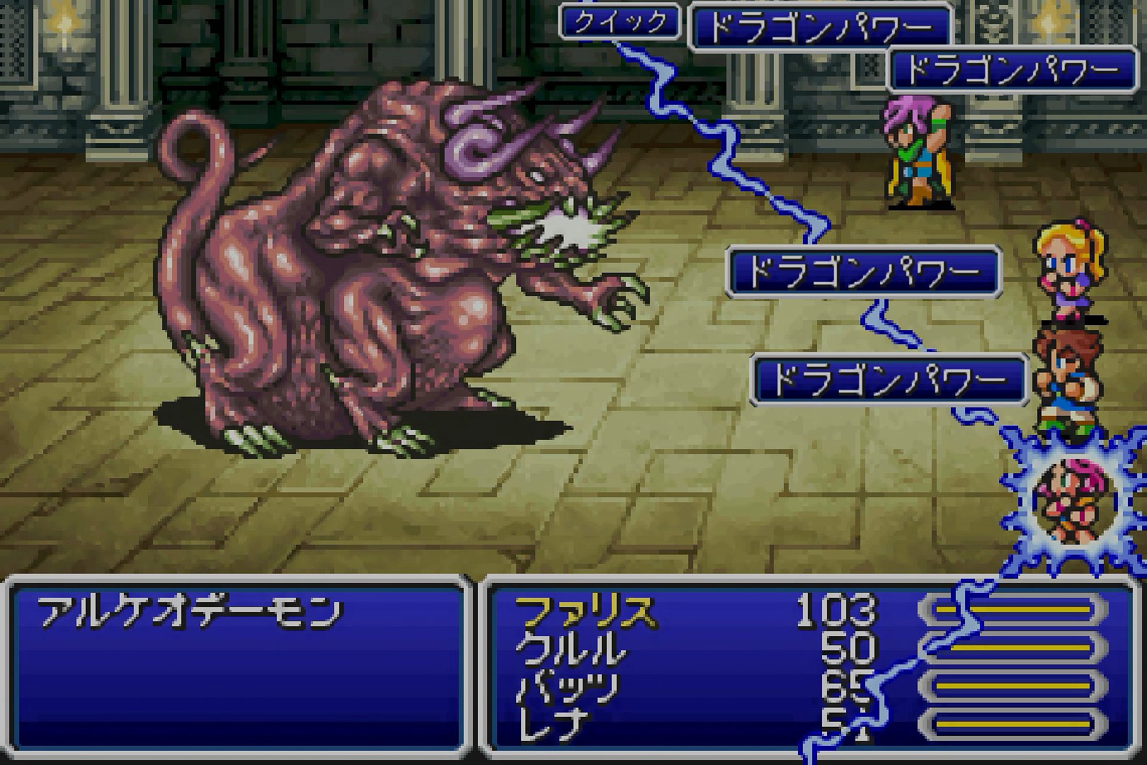 さて。ファリスLv4に引き続き、クルルとバッツは、アタッカーのレナに対し、「ドラゴンパワー」でレベルドーピングを行っていく。この際、使用するのは、「ものまね」のコマンドである。「クイック」による2連続行動が模倣できれば最高だったのだが、さすがにそれは不可能であり、単に「ドラゴンパワー」を単発発動するのみとなる。だが、もし同じ行動をするならば、ボタン入力数が少なければ少ないほど、美しいのである。