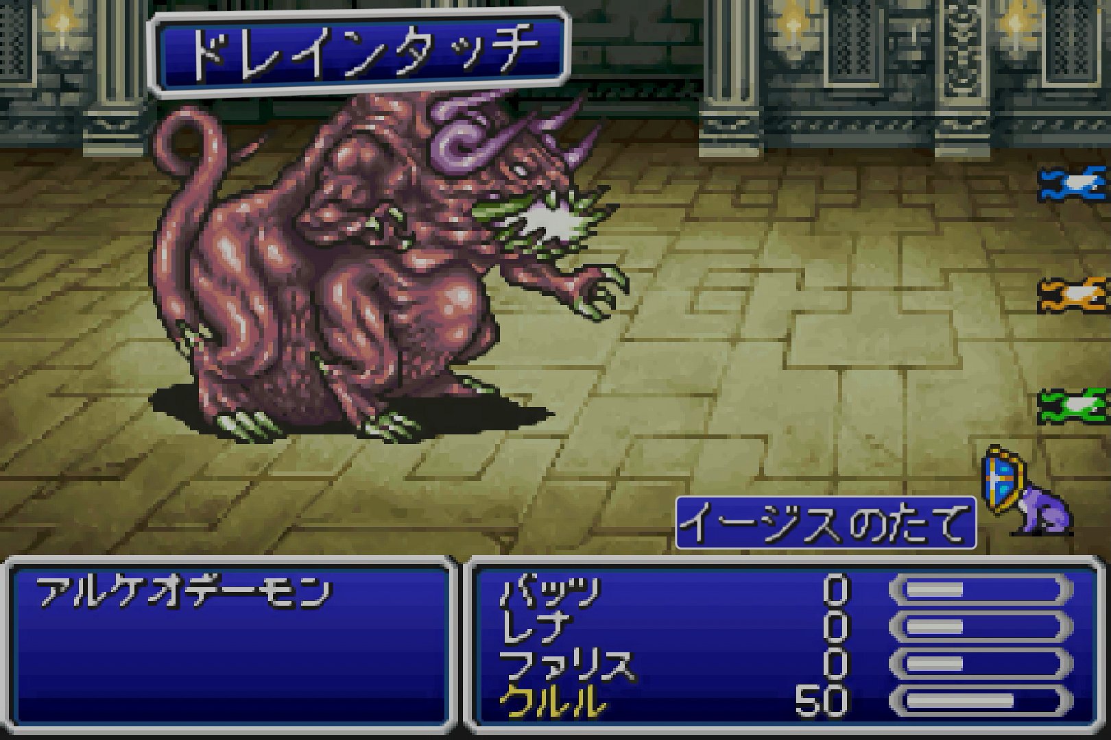 さて。この戦法を行ううえで、私が最大のネックになると思っていたのは、初手の「ドレインタッチ」であった。無属性の魔法攻撃であり、必中であるため、低レベルひとりだと、なすすべもなく瞬殺される。「ミュート」も駄目、リフレク反射も不可能と、八方塞がりであり、これを避けるためだけに「ジャンプ」を解禁しようかと思っていたくらいだ。