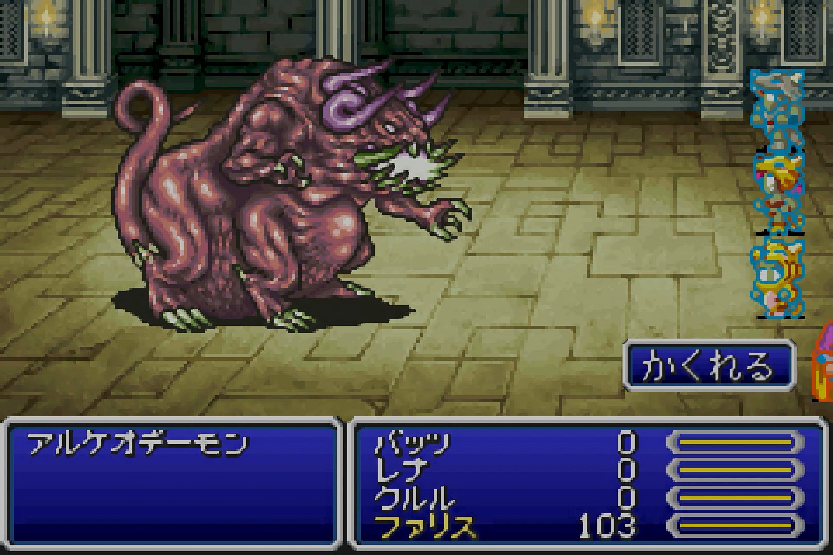 …まず、この戦法を思い立ったきっかけであるが、先のグランエイビス戦にて、ゾンビを使った戦法がボツになっていたことである。ご存じ、FF5のゾンビキャラは、ダメージでは決して戦闘不能とならず、「味方への打撃」のみを繰り返す。そのままだとデメリットだけなのだが、「味方への打撃」を、上手く相手側へ向ける作戦を盾、かつ、非ゾンビのキャラが「かくれる」で身を守れば、多くのボスに通用する、反則級の完封技となるのだ。