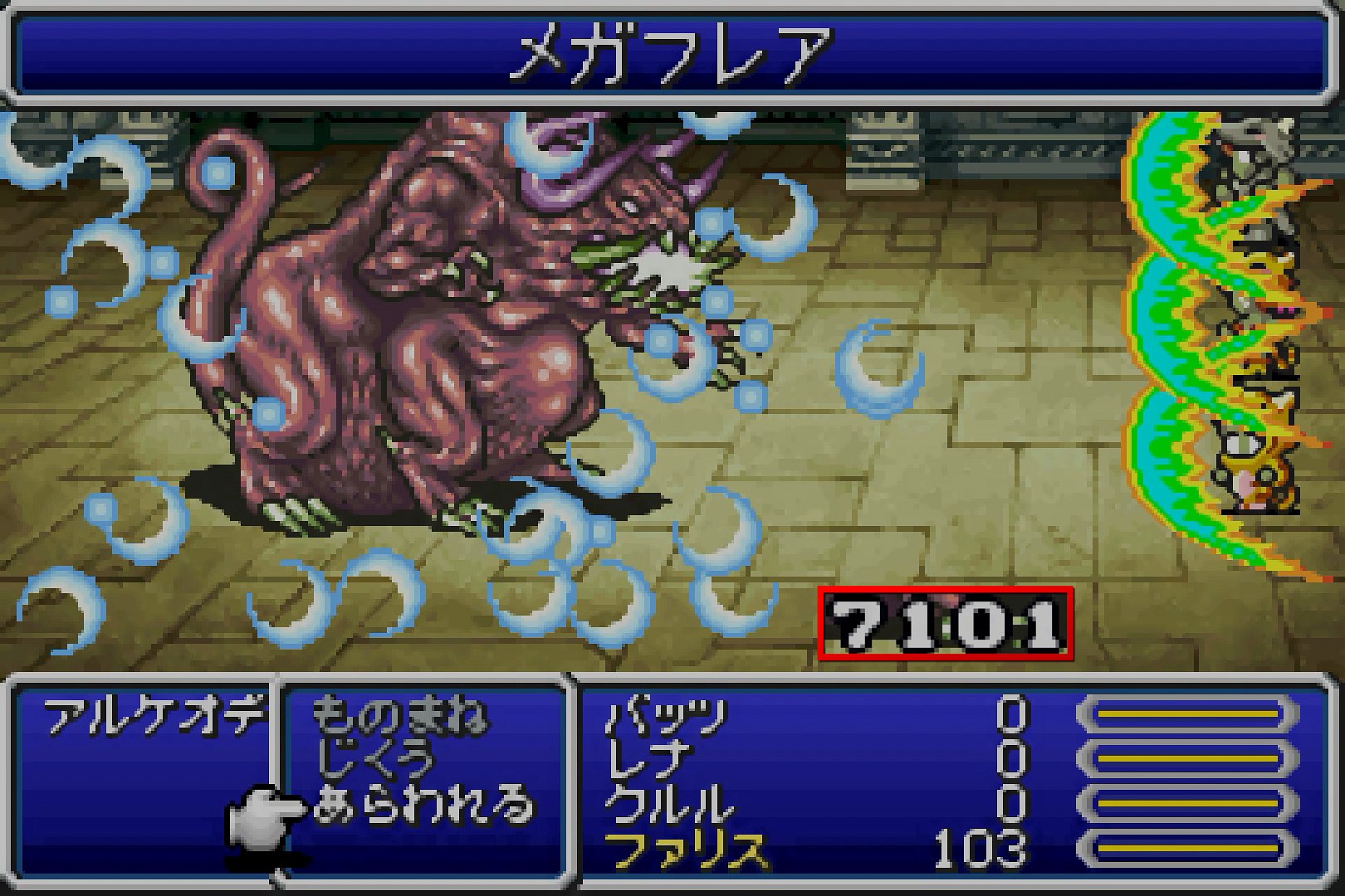 ――さて。グランエイビスは、「ゾンビブレス」を使うため、それでゾンビキャラを作成できる。また、FF5では、「うたう」を使いながらゾンビになると、ゾンビのまま永久に歌い続けるという特性があるらしい。これらを使い、ゾンビ×1人が「英雄の歌」でキャラ強化を行い、2人ゾンビが相手側へと攻撃、そして残った1人は隠れ続ける…という戦法で、「ホワイトウインド」の回復量をも凌駕して、相手を倒せるという算段であった。
