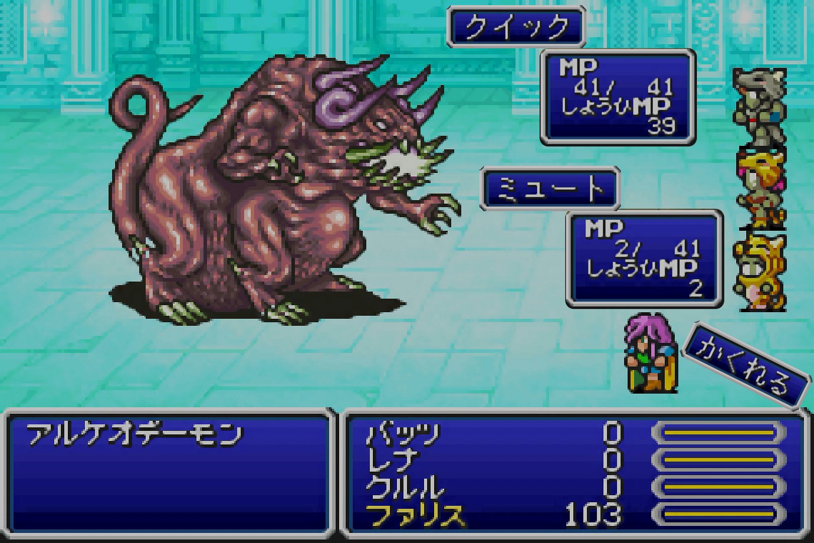 最後に。アルケオデーモンの素早さは「80」である。よって、シーフをマスターしたファリスものまね師が「エルメスの靴」を装備すれば、確実に先手が取れる。その1手目の行動を「クイック」→「ミュート&かくれる」とすれば、初手で全ての態勢を整えられるのだ。