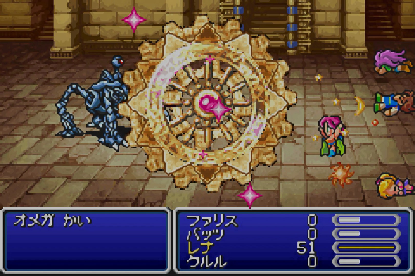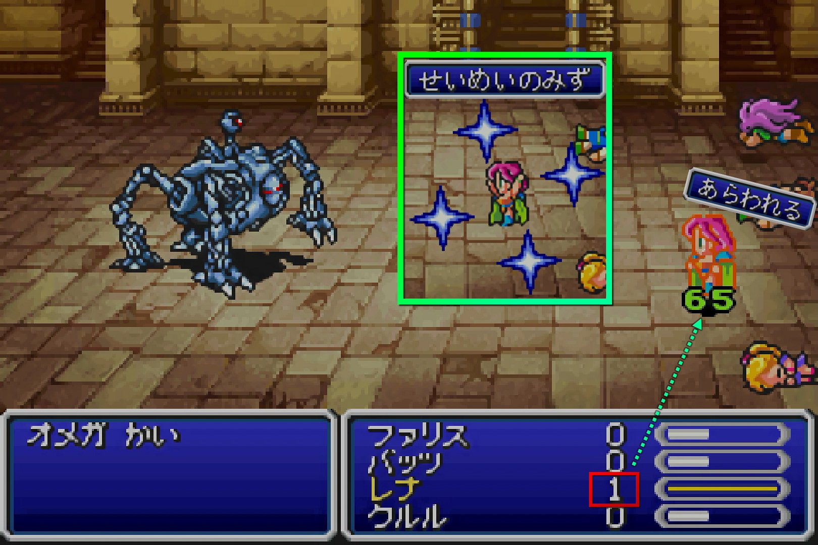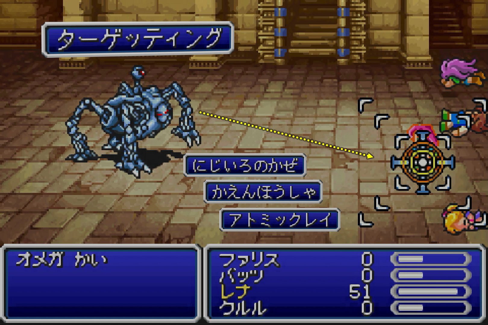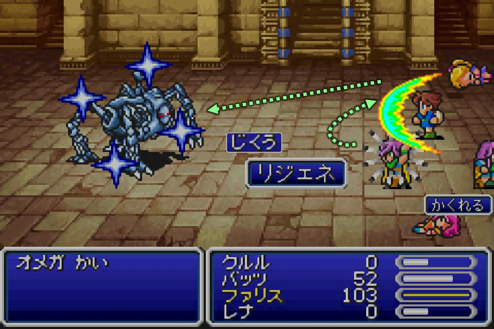 ――さて。リジェネによって敵HP52になれば、そのあと適当な攻撃を当てれば、簡単にトドメを刺せる。「みだれうち」ならば、必中かつ防御力無視の基本性能があるため、楽だろう。オメガ改には、ファイナルアタックは存在しないため、HP0にすればそれで終わりであり、魔法剣やカウンター対策を考える必要は無い。ということで、このリジェネ作戦は、難攻不落の超戦車を沈める最終手段として、FF5ファンたちに静かに知られているものだ。