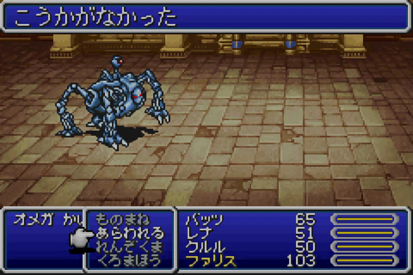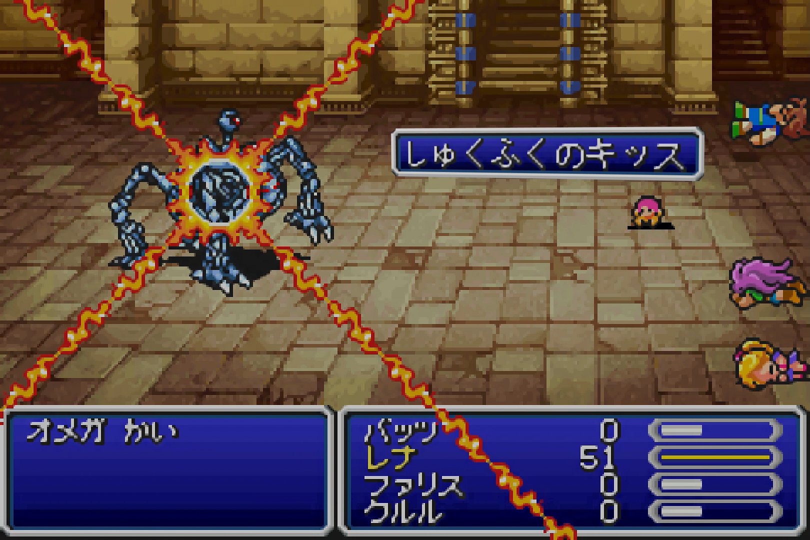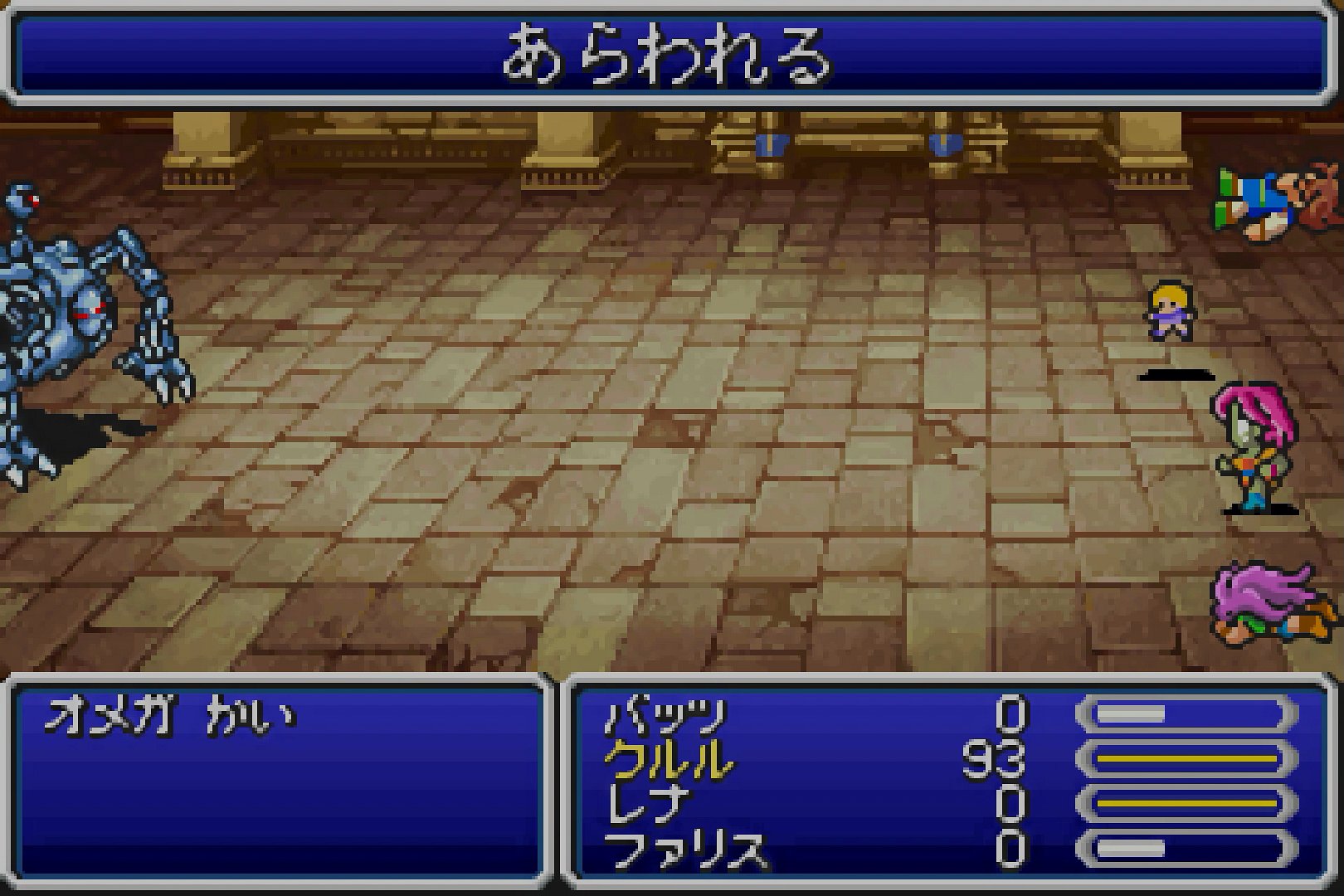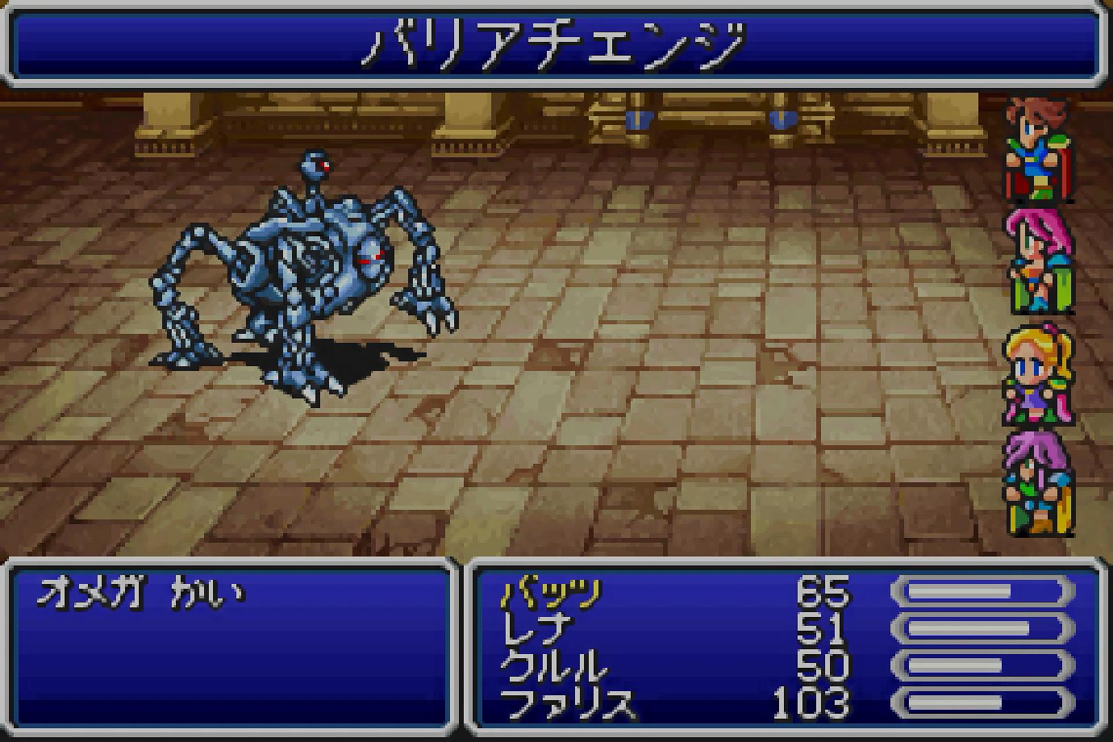 ――さて。リジェネによって敵HP52になれば、そのあと適当な攻撃を当てれば、簡単にトドメを刺せる。「みだれうち」ならば、必中かつ防御力無視の基本性能があるため、楽だろう。オメガ改には、ファイナルアタックは存在しないため、HP0にすればそれで終わりであり、魔法剣やカウンター対策を考える必要は無い。ということで、このリジェネ作戦は、難攻不落の超戦車を沈める最終手段として、FF5ファンたちに静かに知られているものだ。