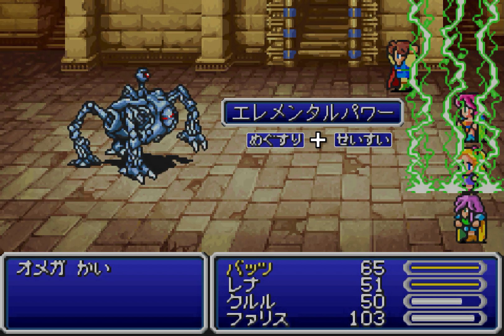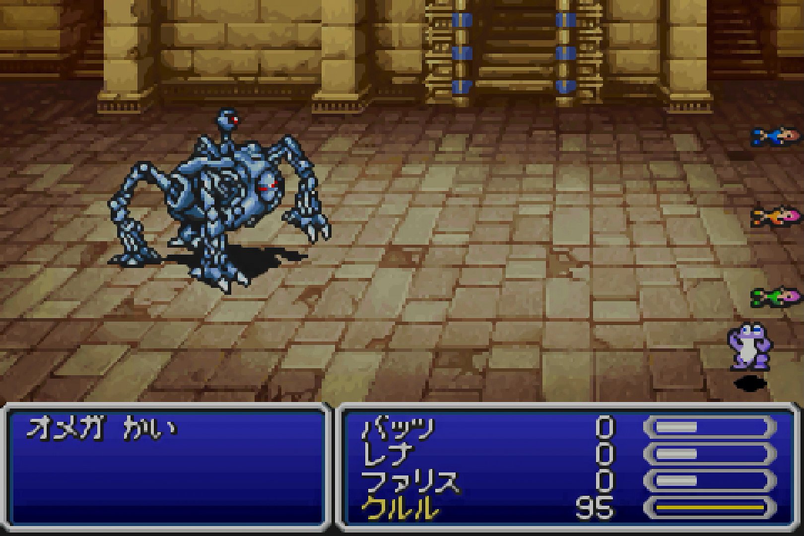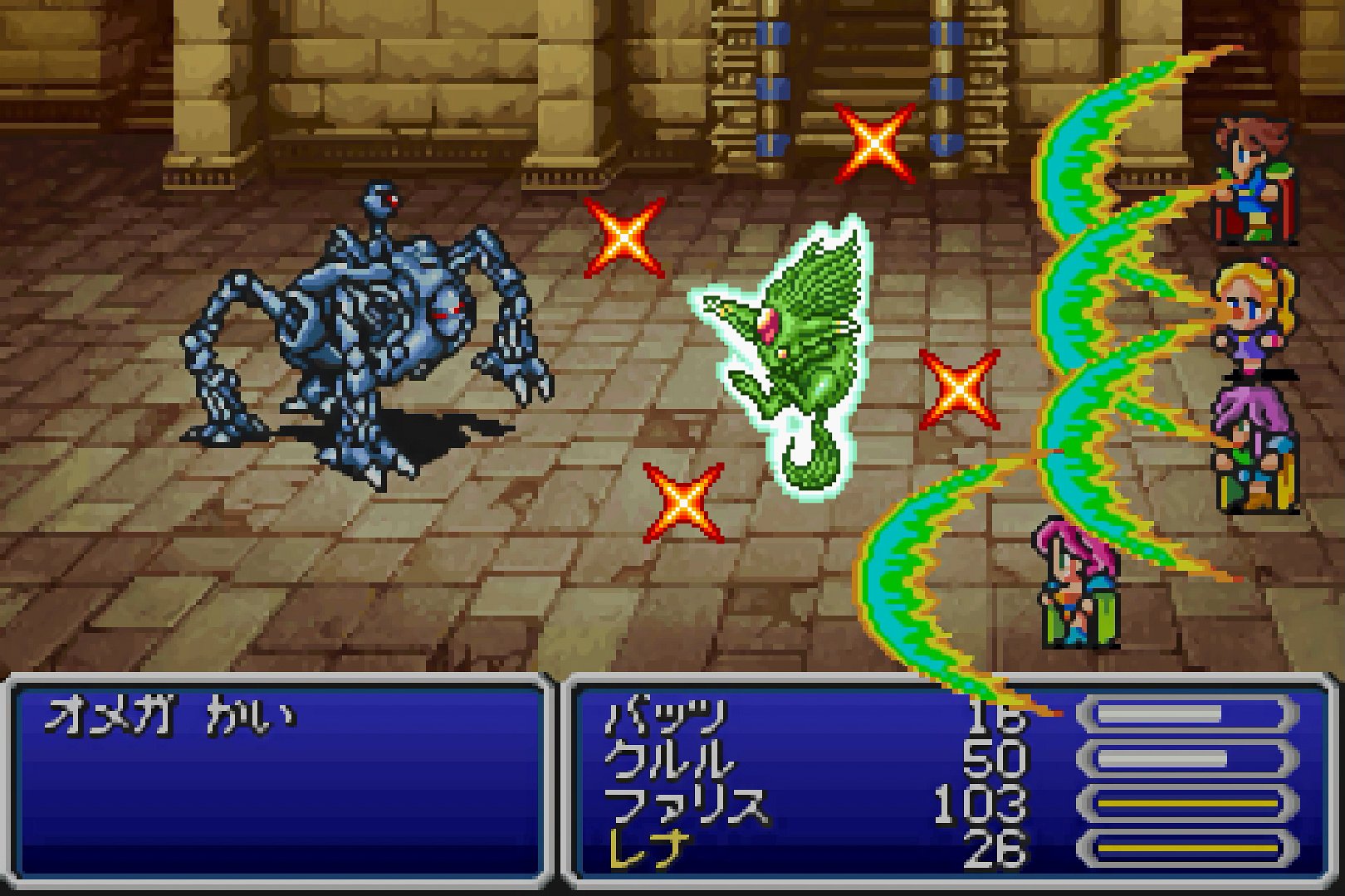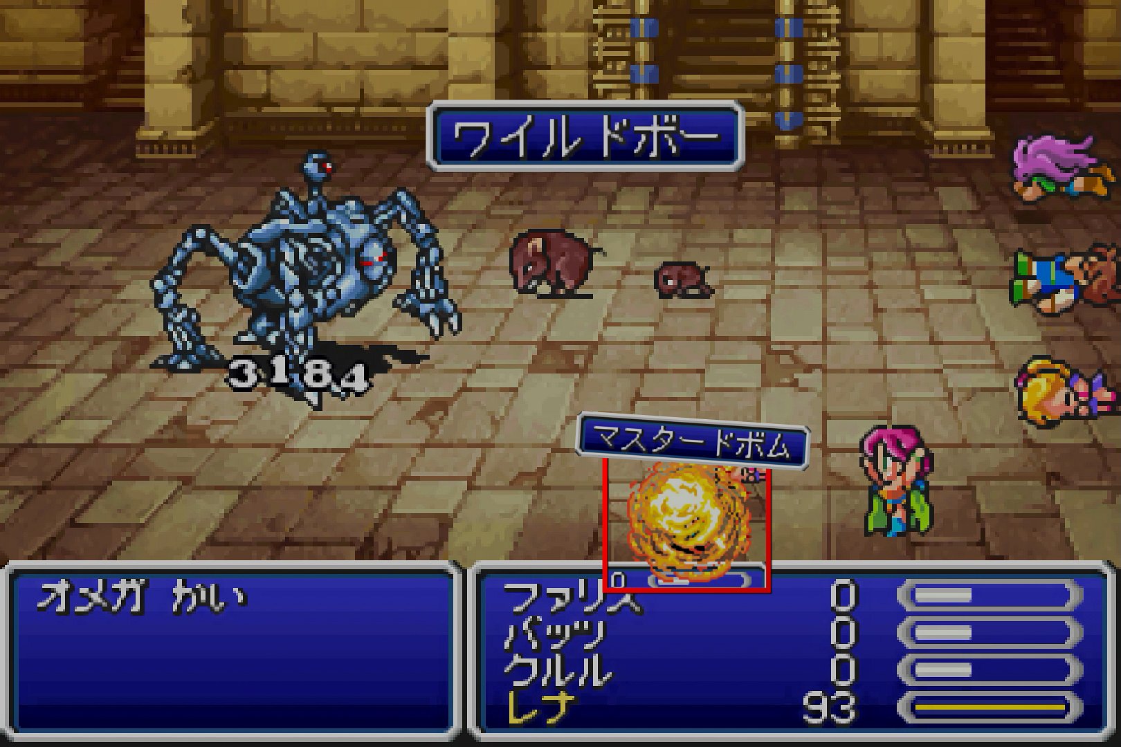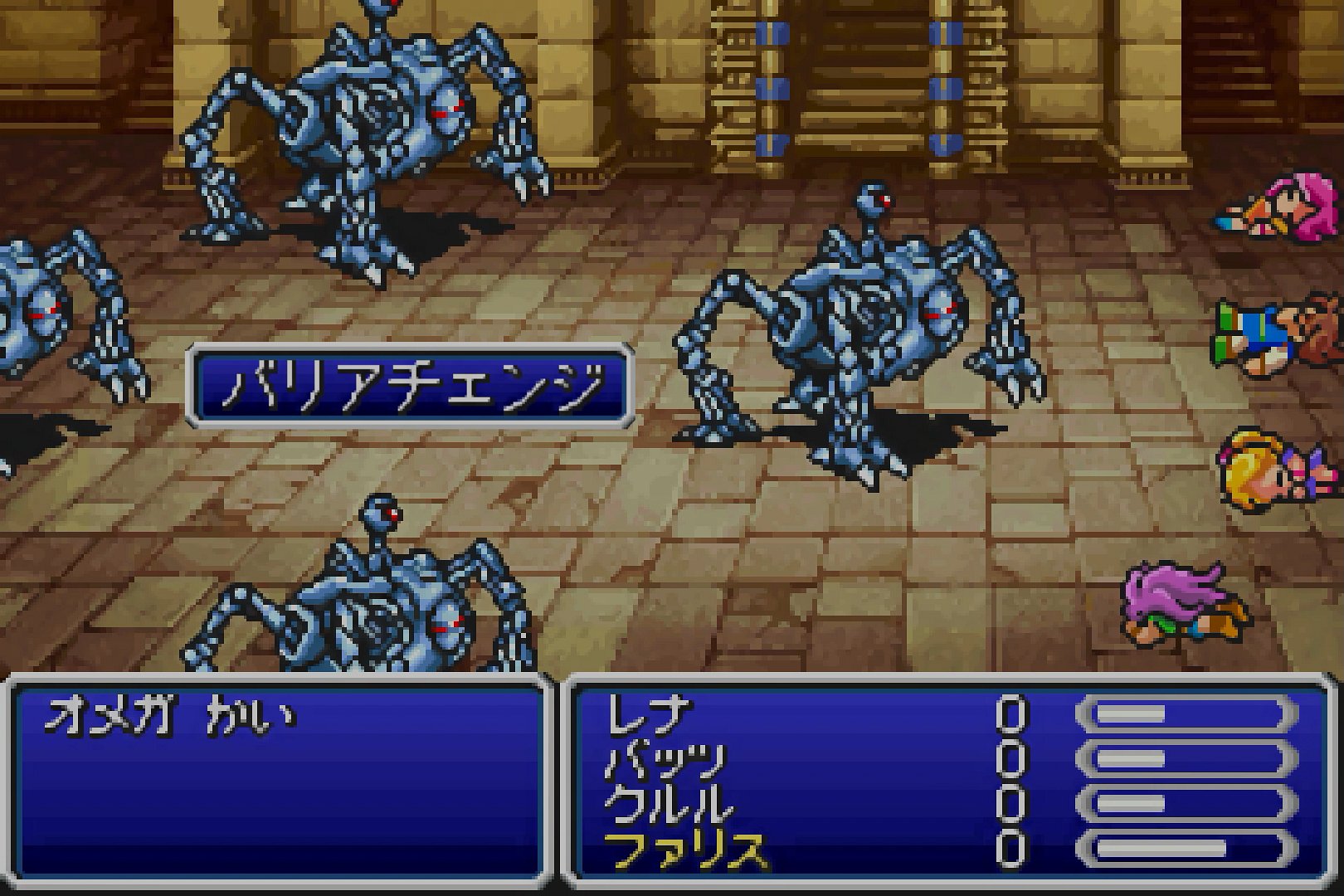 ――さて。リジェネによって敵HP52になれば、そのあと適当な攻撃を当てれば、簡単にトドメを刺せる。「みだれうち」ならば、必中かつ防御力無視の基本性能があるため、楽だろう。オメガ改には、ファイナルアタックは存在しないため、HP0にすればそれで終わりであり、魔法剣やカウンター対策を考える必要は無い。ということで、このリジェネ作戦は、難攻不落の超戦車を沈める最終手段として、FF5ファンたちに静かに知られているものだ。