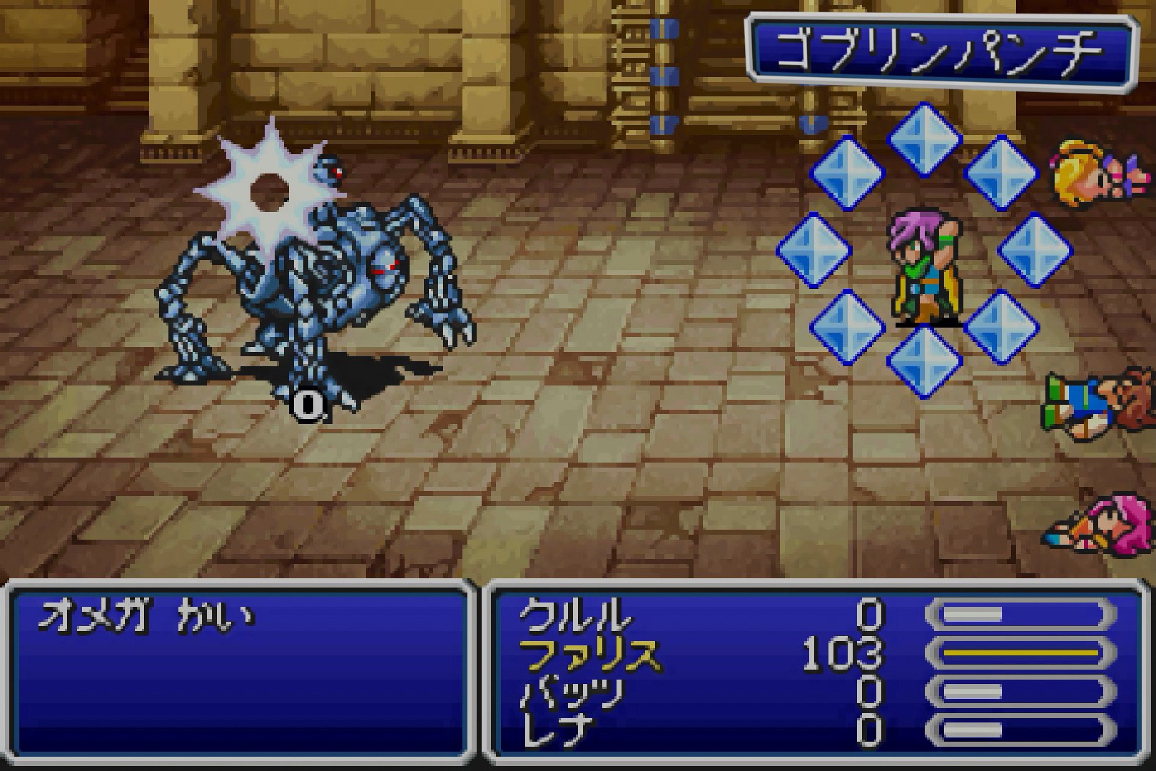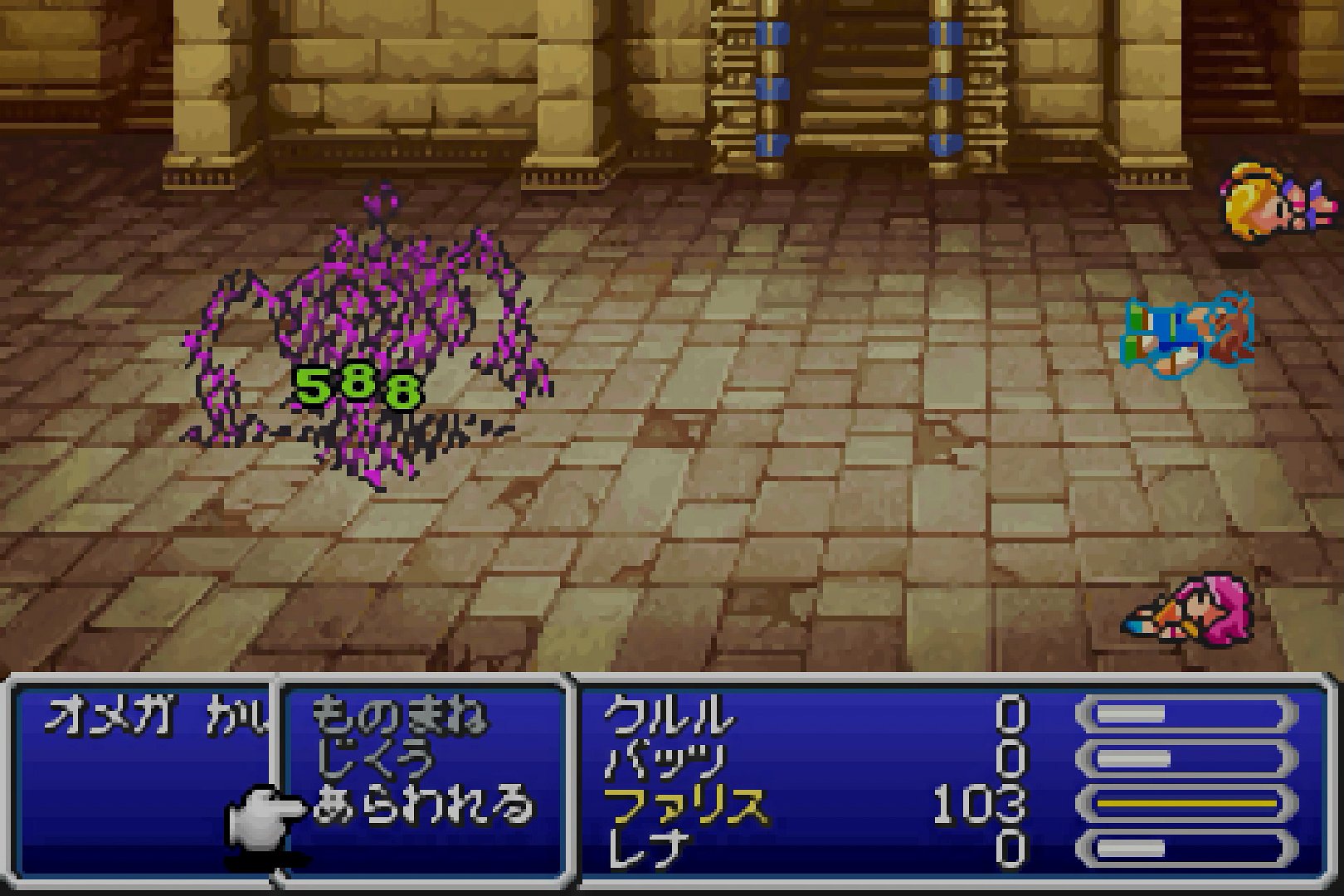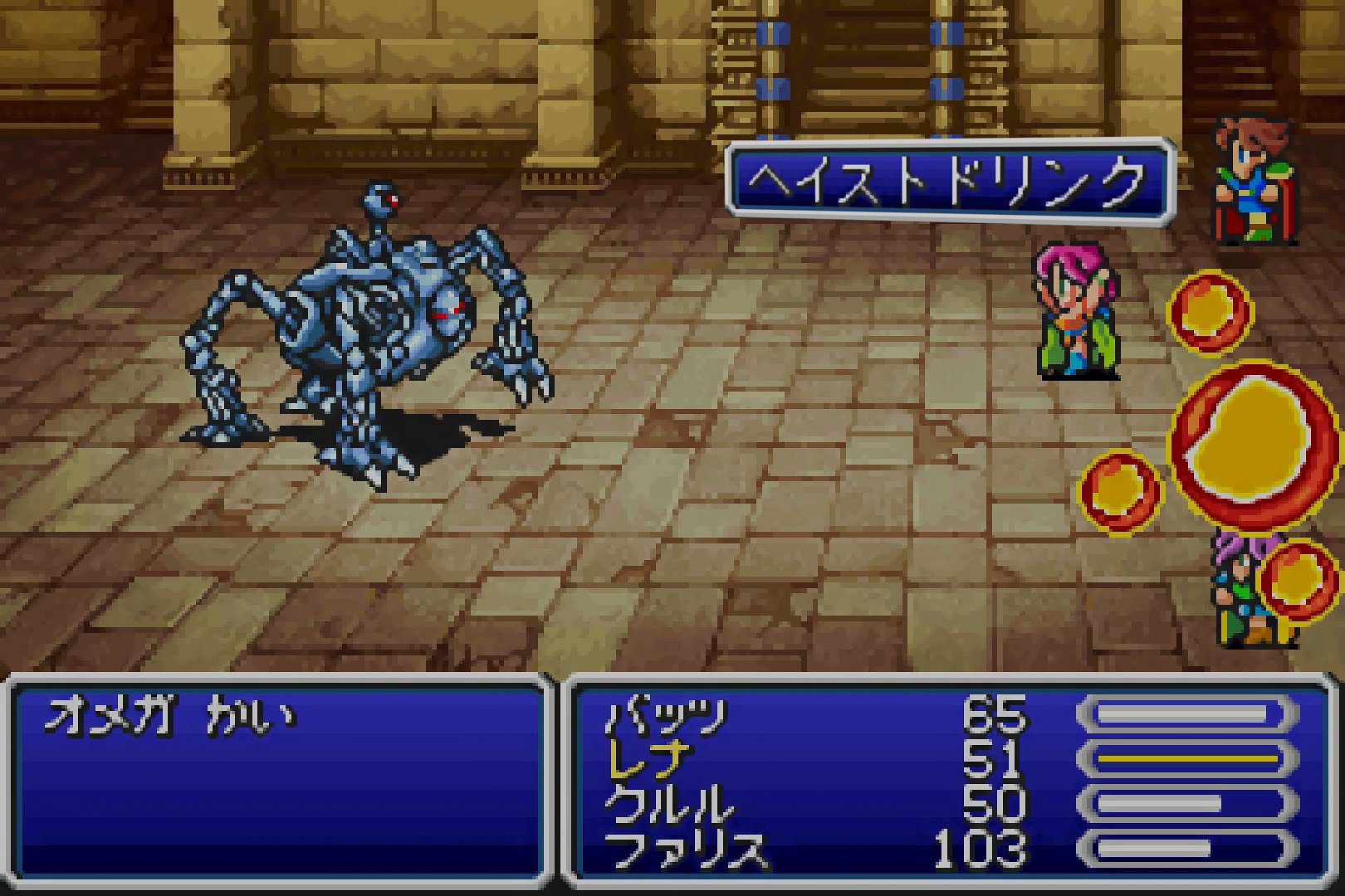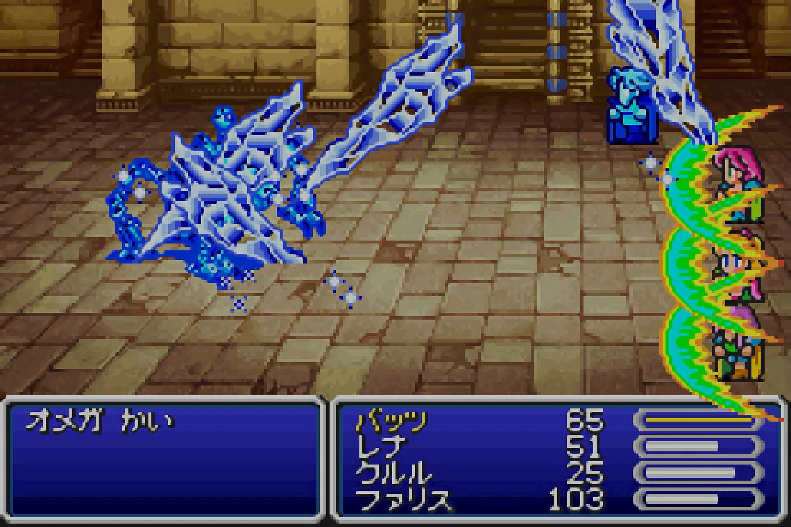 ――さて。リジェネによって敵HP52になれば、そのあと適当な攻撃を当てれば、簡単にトドメを刺せる。「みだれうち」ならば、必中かつ防御力無視の基本性能があるため、楽だろう。オメガ改には、ファイナルアタックは存在しないため、HP0にすればそれで終わりであり、魔法剣やカウンター対策を考える必要は無い。ということで、このリジェネ作戦は、難攻不落の超戦車を沈める最終手段として、FF5ファンたちに静かに知られているものだ。