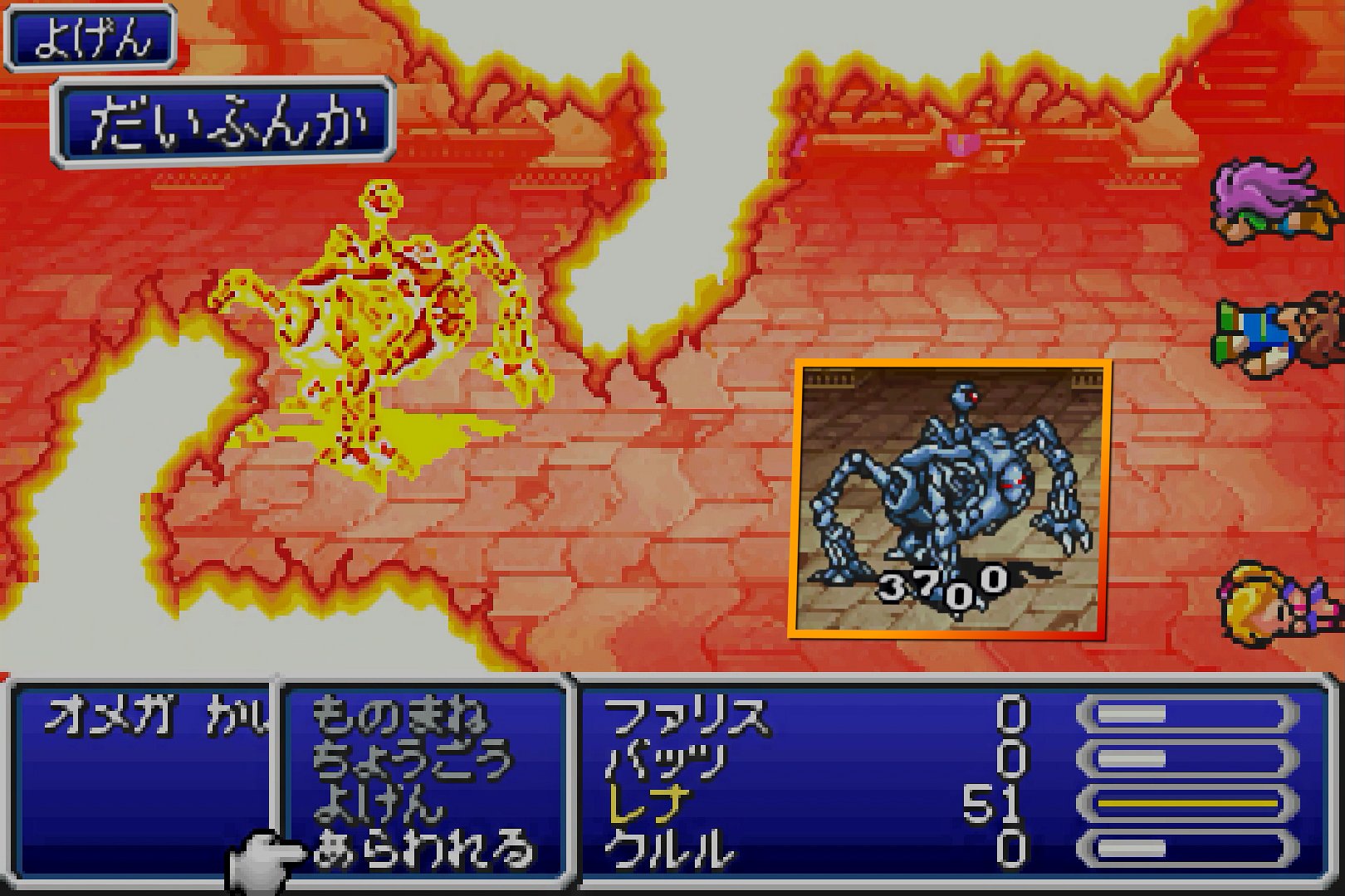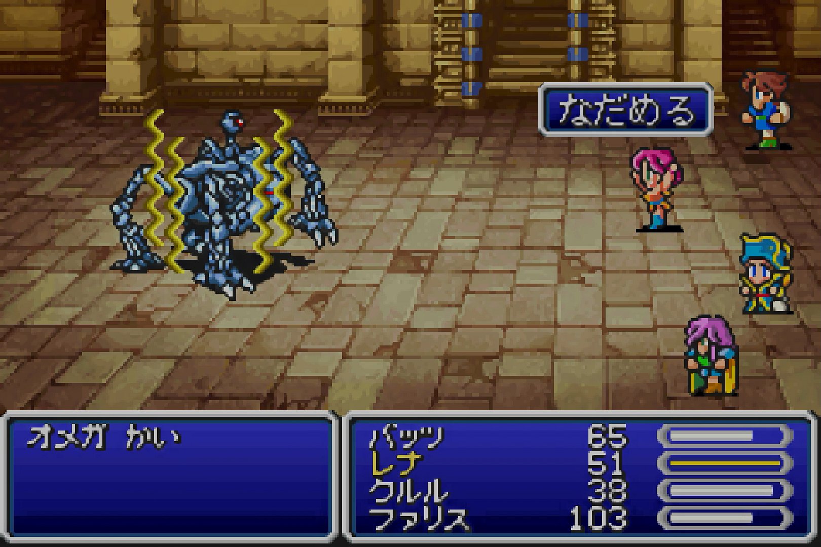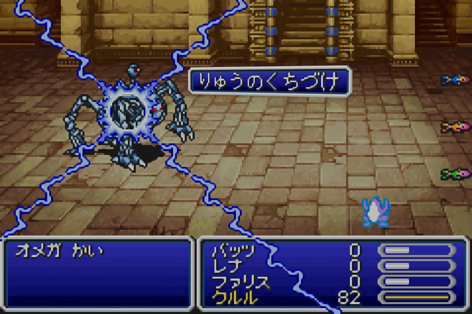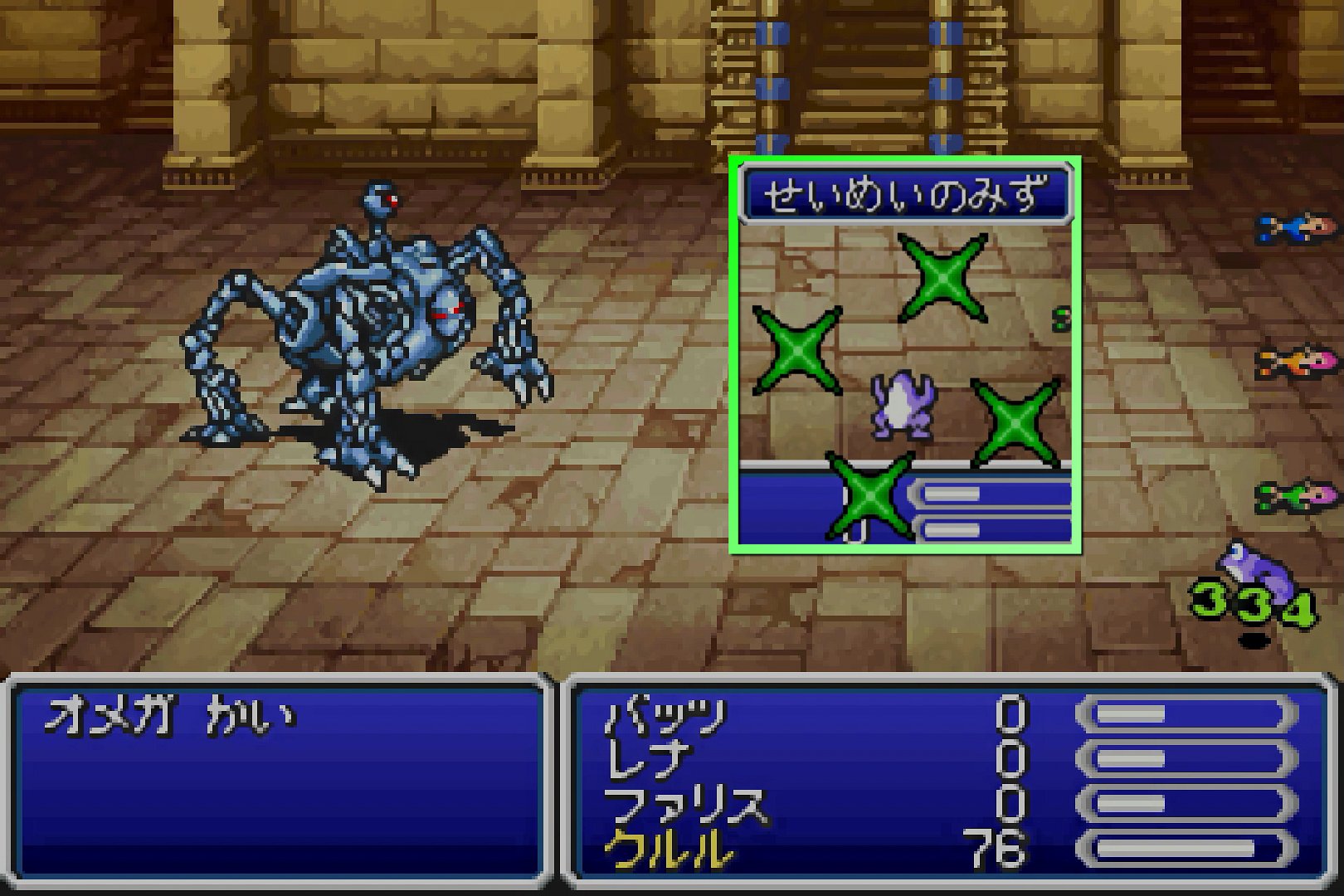 ――さて。リジェネによって敵HP52になれば、そのあと適当な攻撃を当てれば、簡単にトドメを刺せる。「みだれうち」ならば、必中かつ防御力無視の基本性能があるため、楽だろう。オメガ改には、ファイナルアタックは存在しないため、HP0にすればそれで終わりであり、魔法剣やカウンター対策を考える必要は無い。ということで、このリジェネ作戦は、難攻不落の超戦車を沈める最終手段として、FF5ファンたちに静かに知られているものだ。