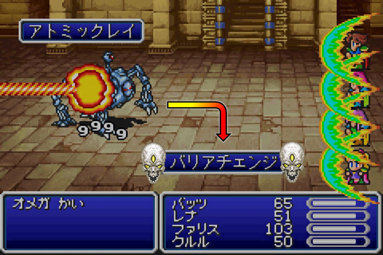 ――ところがどっこい。アトミックレイの反射や、ターゲッティング火炎放射の自爆で炎属性ダメージを与えると、オメガ改のカウンター@:「魔法剣以外で弱点属性の攻撃を受けた」を満たしてしまい、「バリアチェンジ」が発動されてしまう。すると、弱点属性が炎以外に変わってしまい、以降は再び炎弱点に戻るまで、自爆によるダメージに期待ができなくなる。しかも、弱点属性が変わる=戦闘個体が変化すると、敵の行動ルーチンも入れ替わる。初回ならば、ルーチン頭から攻撃されるだけであるが、再び炎属性に戻そうとガチャガチャやっているうちに、何が何だか分からなくなっていく。そうこうしているうちに、運悪く「波動砲」→「波動砲」を引いてしまえば、それでバトルは終了だ。