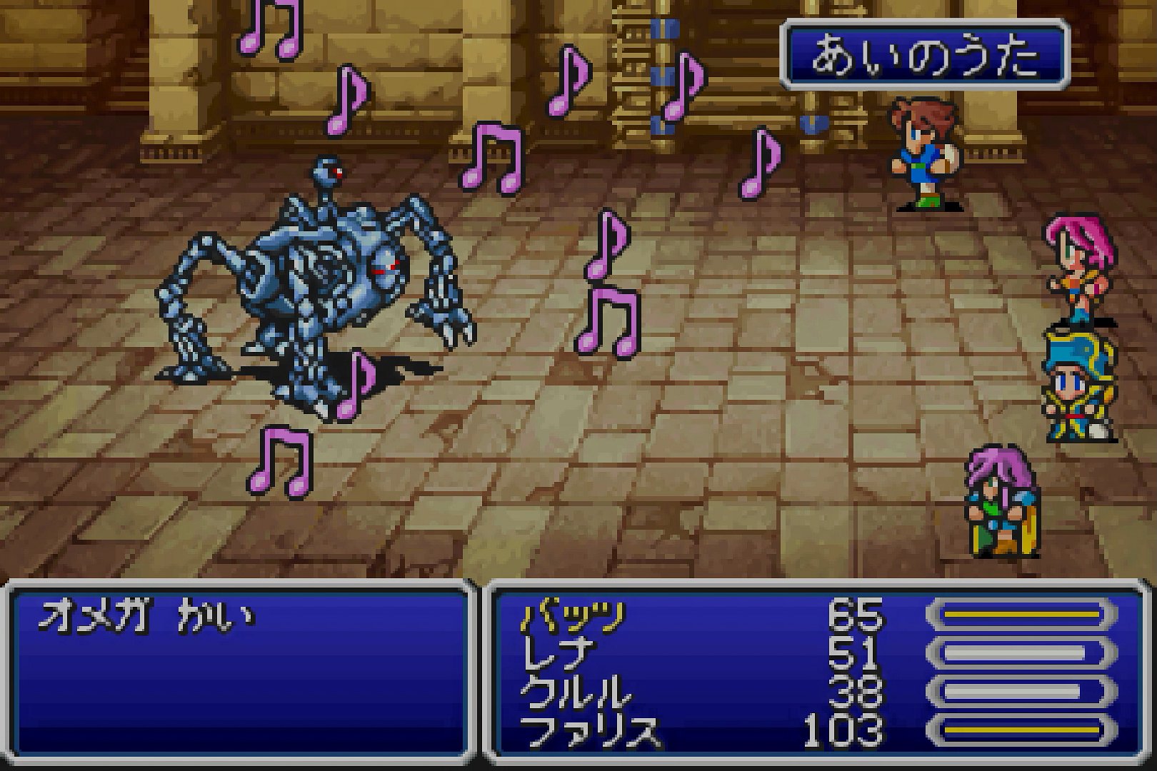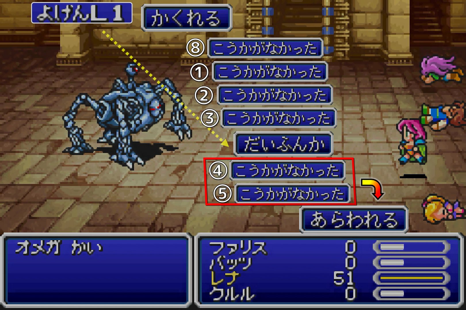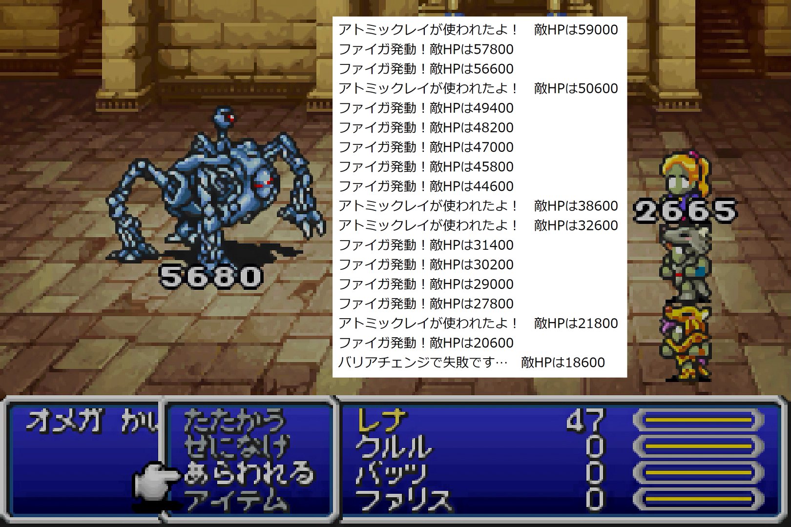 ――ちなみに。失敗パターンについてであるが、私は何となく、「複数人にターンが同時に回ってきた際に、失敗しやすい」と感じていた。ご存じ、FF5では、誰かにターンが回ってきたときに、時間進行が停止するというシステムになっている。だが、恐らく、「複数人のゲージが同時に満タンとなった場合には、次の者にターンが回る際に、1カウントだけバトルが進む」とか、そういう感じの仕様があるのだろう。上記のリストで分かった通り、今回は僅かでも行動が滞ると、「愛の歌」の無限ループに失敗してしまう。オメガ改は、そう簡単に、愛の歌だけで完封できる相手ではないのだ。