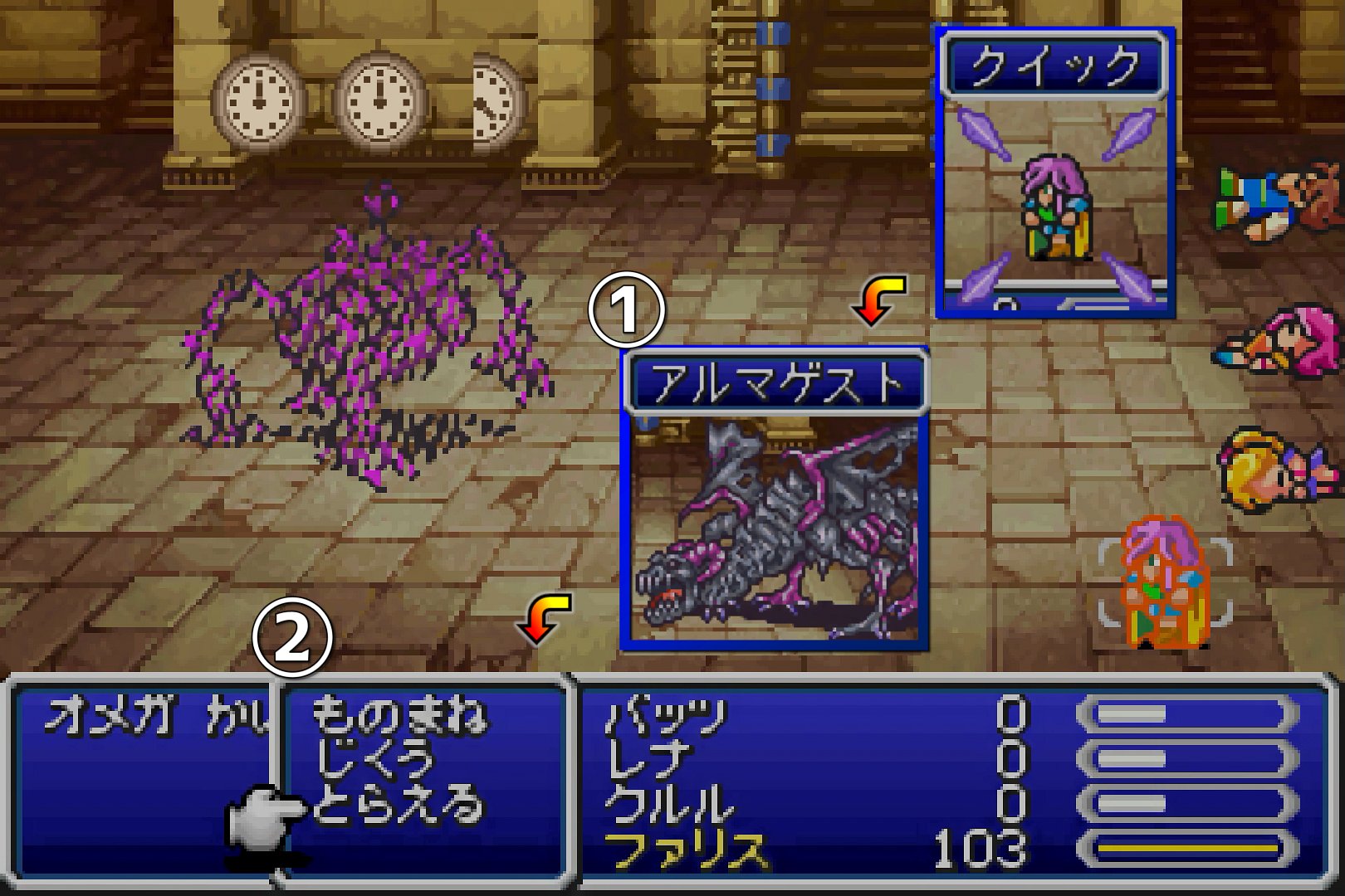 ――よって、まずは、ファリスLv4をものまね師とし、「金の髪飾り」「エルメスの靴」を装備したうえで、「クイック」を使用し、「リジェネ&かくれる」の2連続行動を入力する。エルメスの靴を装備するだけだと、オメガ改には先行できず、まず「バリアチェンジ」を使われてしまうが、それで良い。バリアチェンジをすると、全てのステータス異常は解除されてしまうため、むしろ「まさむね」で初手を取ってリジェネを掛けると、全くの無駄になってしまう。ヘイスト状態ならば、オメガ改の2ターン目(=バリアチェンジ後の1ターン目)には確実に先行できるため、そこでクイックを入力できる。