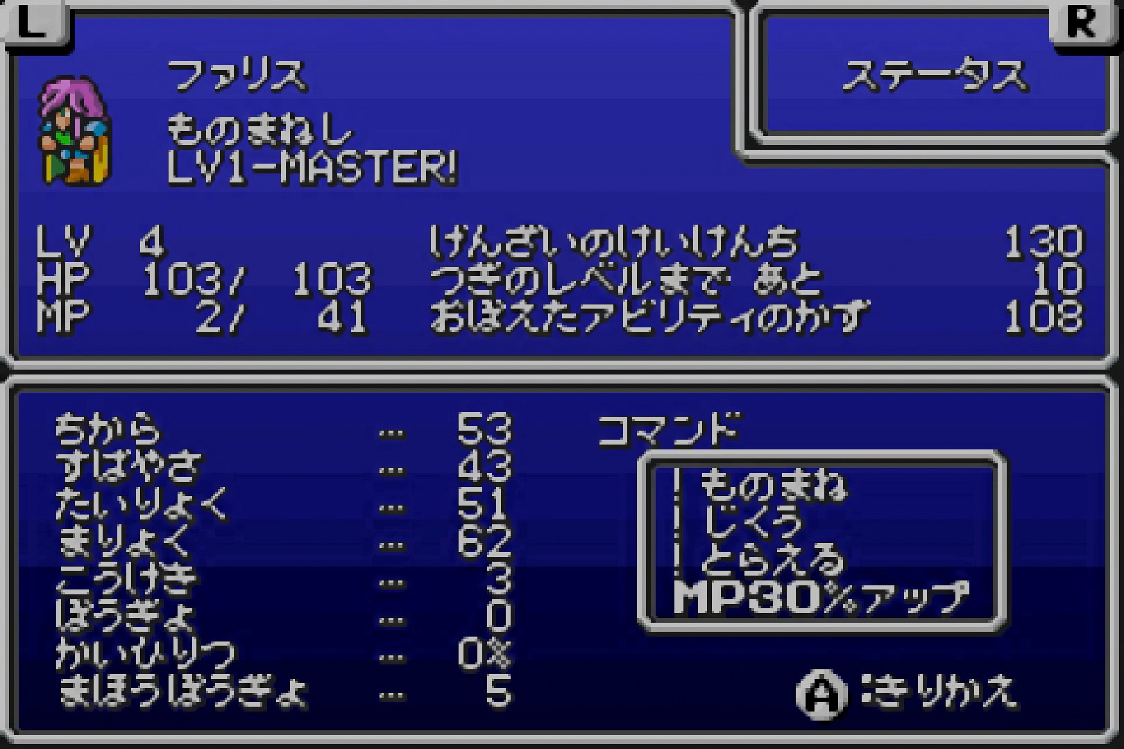 ちなみに、バッツLv2のHPを「52」に調整する方法だが、青魔道士に「HP10%アップ」を付けると、ちょうどHPが「52」になるため、そこで回復を行ったあと、すっぴんにジョブチェンジをすれば良い。「自爆」も青魔法であるため、覚えやすいというのが魅力である。かくして、厄介なHP調整についても、メニュー画面だけで完結させられることになり、利便性が上がった。