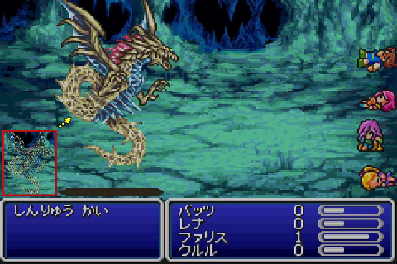 ――やれ、この辺りは、また神竜改の攻略をする時に、詳細に調べなければならないのだが、どうも神竜改には、「HP管理をする本体」と「攻撃を担当するダミー」が存在するようだ(本体が単体で無敵と非無敵を定期的に変更する。ダミーと入れ替わる性質は無い)。そして、本体のHPが0になったとき、ファイナルアタックのギガフレア&メテオを放ちつつ、ダミーを消滅させてバトル終了…という処理になっている。その処理を、FA封じによってスキップしてしまうと、ダミーターゲットが本体を復活させてしまうということのようだ。つまり、最後のギガフレア&メテオを喰らわなければ、バトルが終わらないのである。FA封じに明確な対策を持った、FF5で唯一のモンスターである。