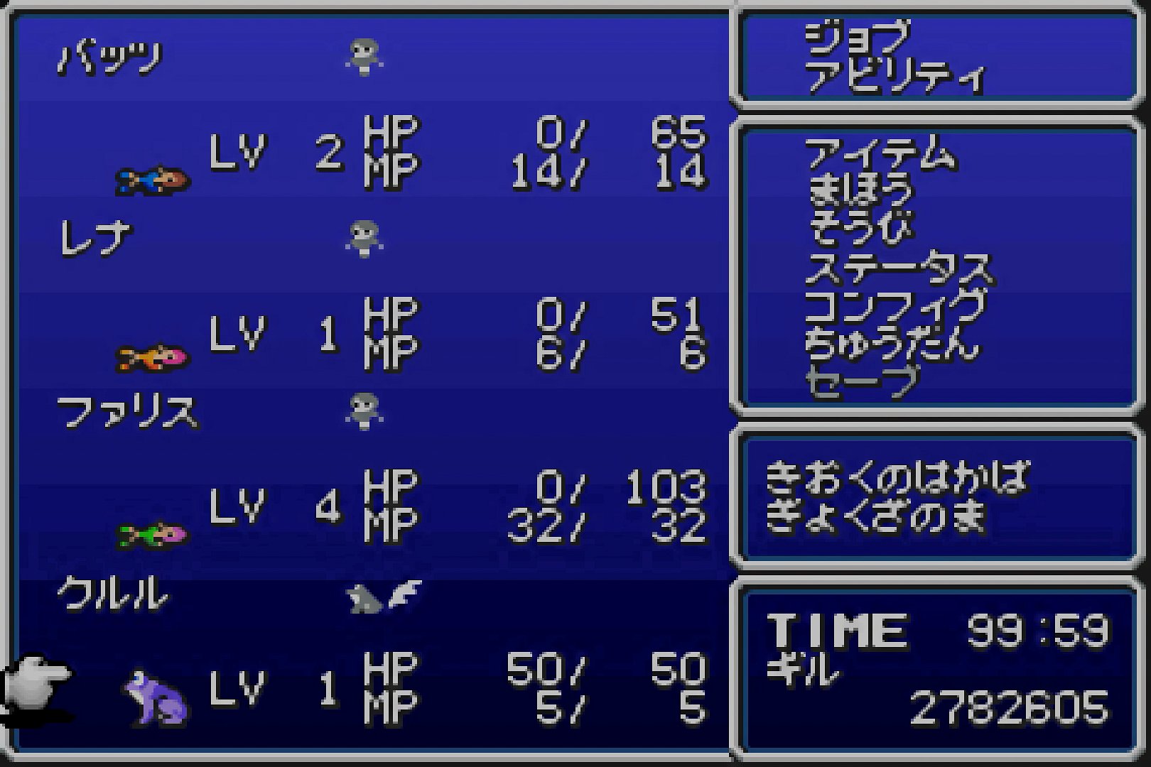 ちなみに、勝利パターンでは、謎にクルルが砲撃士となっているが、これは素早さを調整して、強化を終えた次点でで、無駄なくファリスにターンが回ってきて、「みだれうち」を使えるようにするためである。
