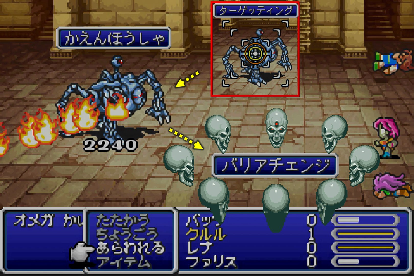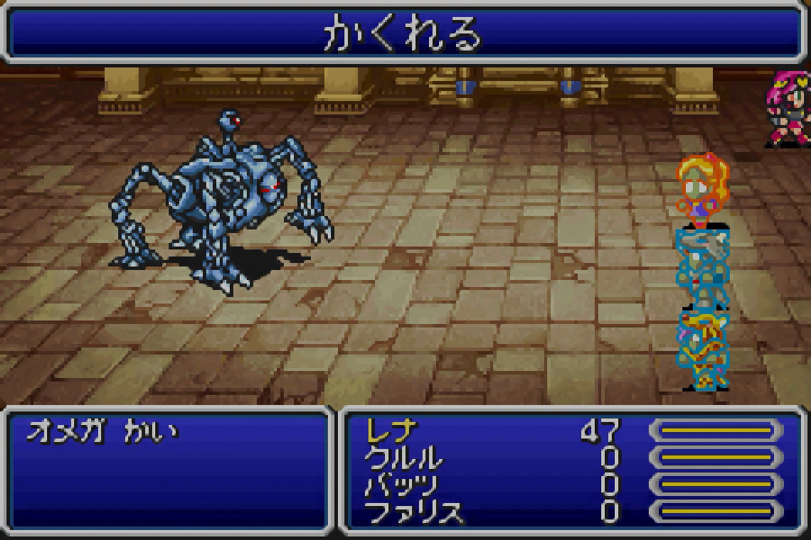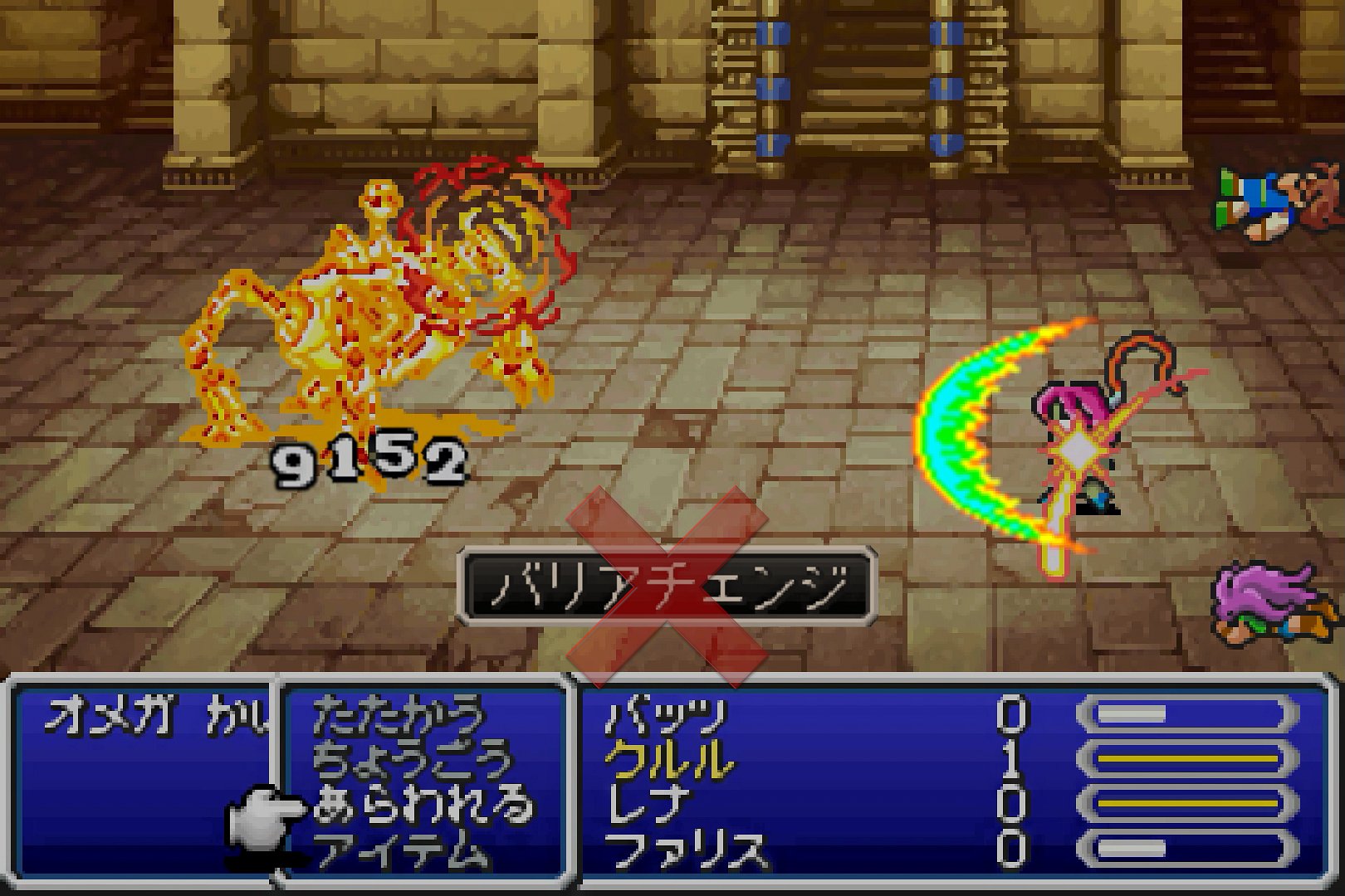 しかしながら。この状態を作るためには、「バッツ側にターゲッティングを当てる」という手順が必須になるため、リフレクトリングを装備することができない。つまり、「デルタアタック」が来たら終わる。ファリスLv4を使い、巨人の薬でHP上昇をさせ、無駄に魔法防御力の高いGBA版追加装備で固め、シェル状態を貼ってみたりもしたが、それでもやっぱり、死ぬ時は死ぬのだ。