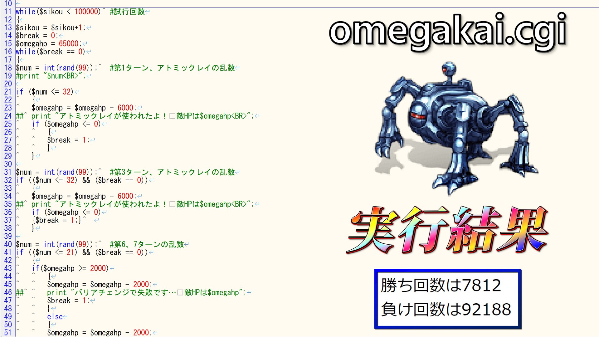 …まず、オメガ改は、「リジェネ」で588のHPを回復すると、残りHPが52になるという性質が知られている(GBA版のみ)。オメガ改のHPは65000であり、そこから588を足すと、65588となる。だが、昔のゲームにありがちな上限の65536(=216)を超えたということで、数値がループをし、65588