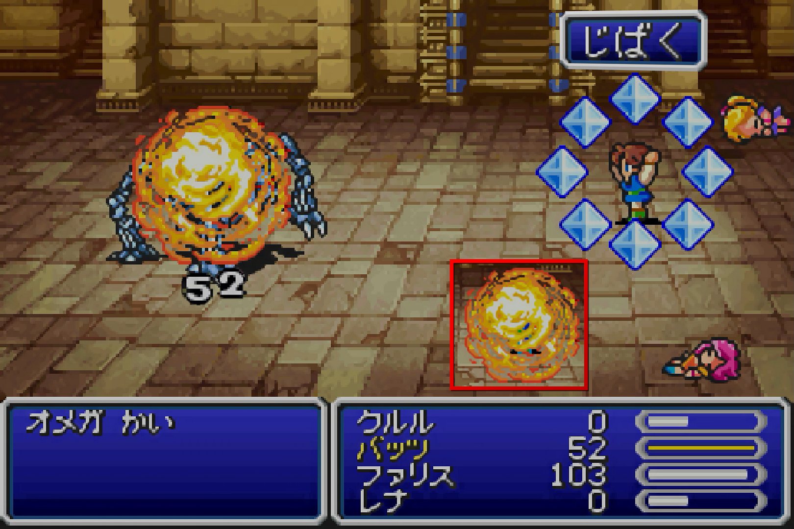…そうして、バッツにターンが回ってきたら、バッツは「自爆」を使う。これにより、手はず通り、オメガ改に「52」の固定ダメージを与えられる。さらに、ファリスは既に「クイック