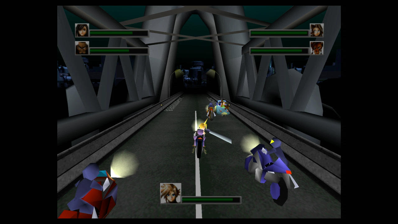 さて。2パーティでの戦いが終わると、いったんセーブをすることができ、その後に神羅ビルから盗んだバイクと車を使って逃走することになる。この逃走はミニゲーム形式となっており、追手を撒くために、バイクに乗ったクラウドを左スティック(方向キー)で左右に動かし、□で左方向に、◯で右方向に攻撃をする。なお、FF7の遊び要素として名高いゴールドソーサーでも、これと同内容のものを遊ぶことができる。