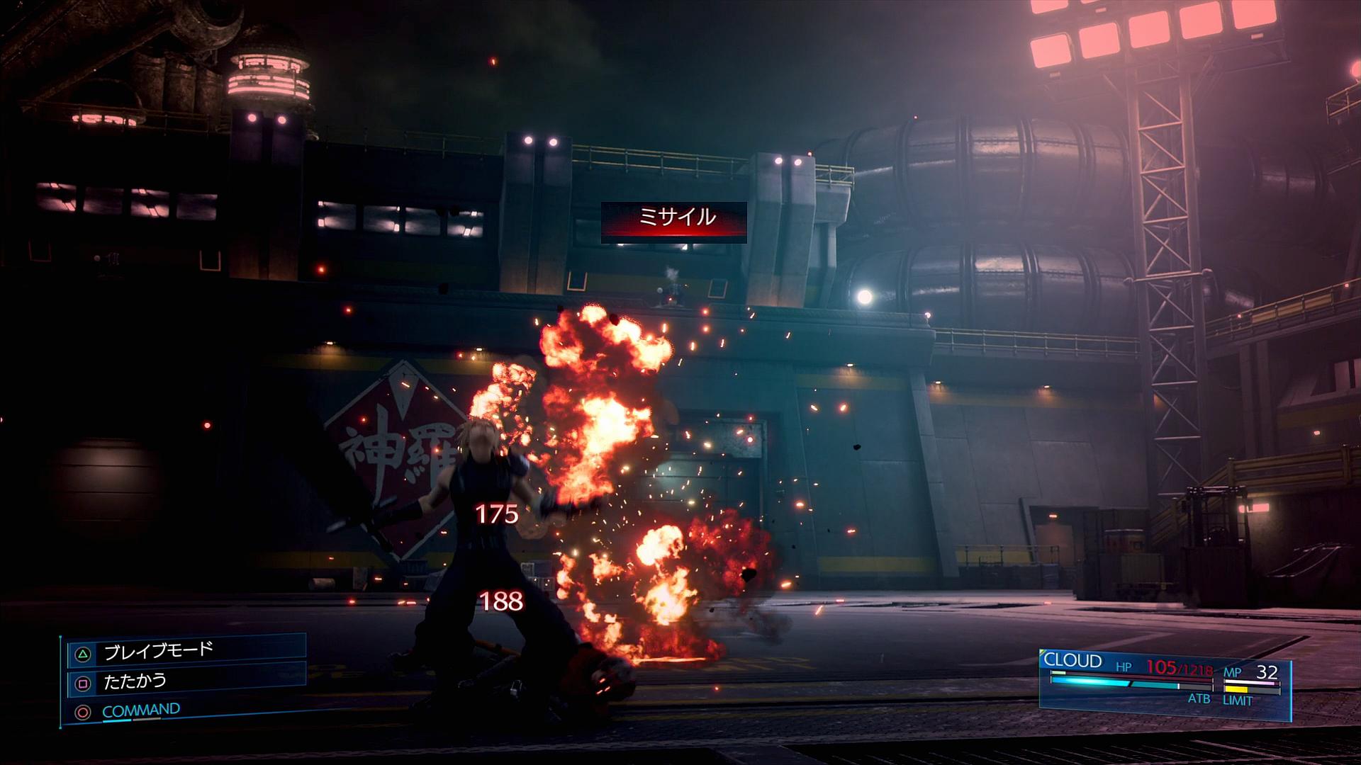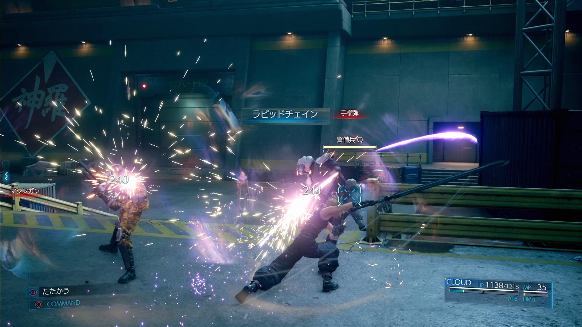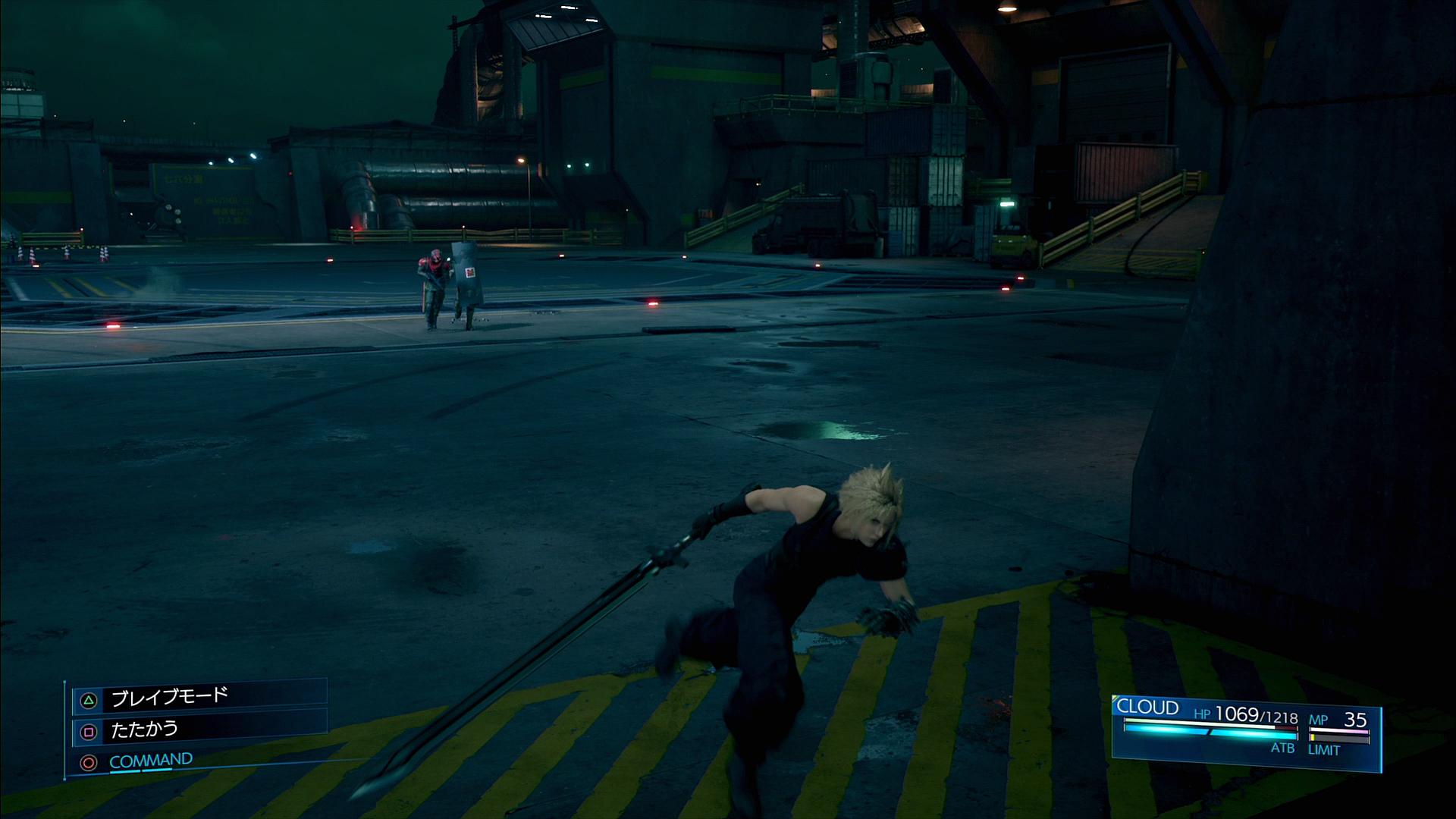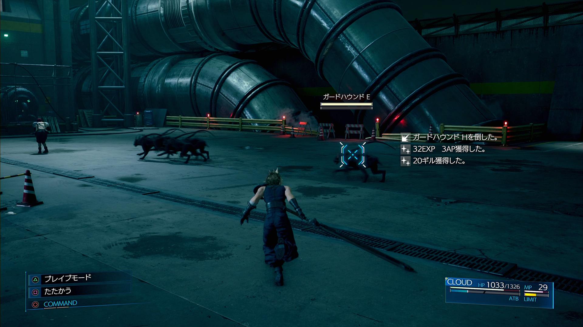 …なお、この第1戦においては、ビッグスとウェッジは、それぞれ高い所から失礼して敵兵士を銃撃してくれると同時に、敵兵士の攻撃をある程度まで自分へと引きつけてくれる。ちなみに、このビッグスとウェッジの銃撃で敵兵士のHPをゼロにすることもできる。その瞬間、私は「よし!」と思ったが、残念ながらビッグスかウェッジが倒しても、経験値はクラウドへと入ってしまった。Oh……。