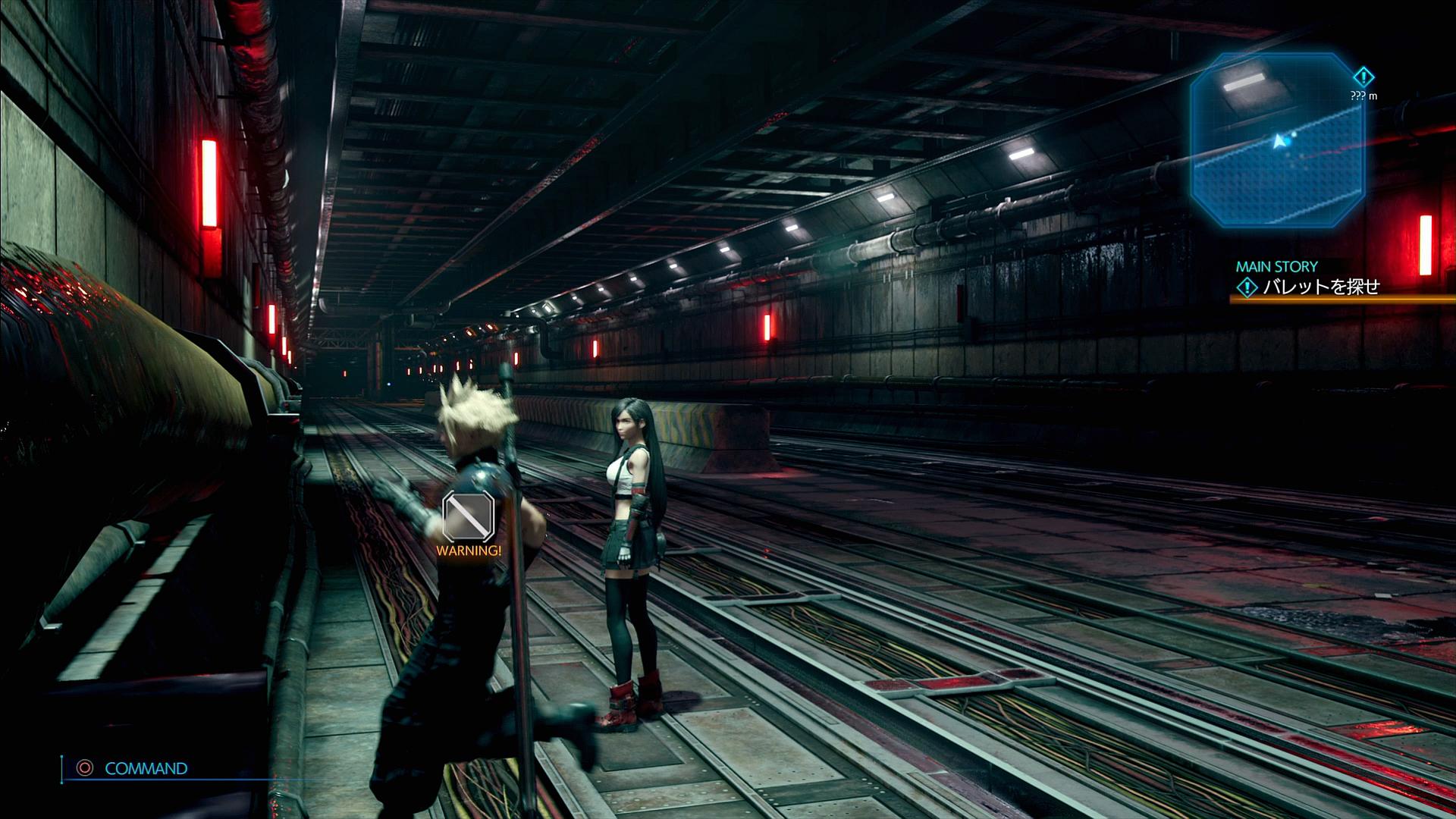 …やれ。ここでは、直前に時間制限に間に合っていた場合はクラウド&ティファの2名で、時間制限をオーバーしていた場合はクラウド1名で始まり、残りのキャラクターを集めてから、トンネル内部を探索する…というふうに物語が進行していく。ところが、その進行方向を制限する壁は、例の「WARNING!」のイベント壁であるため、前回