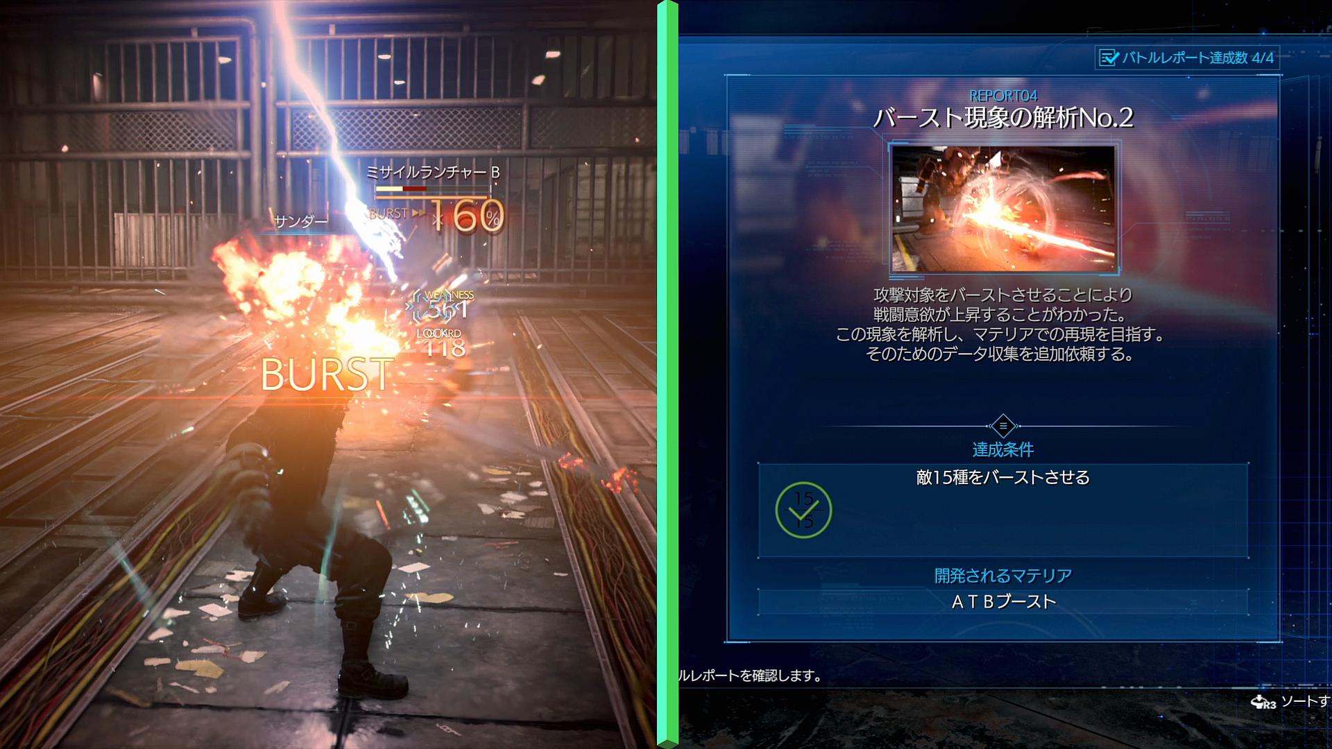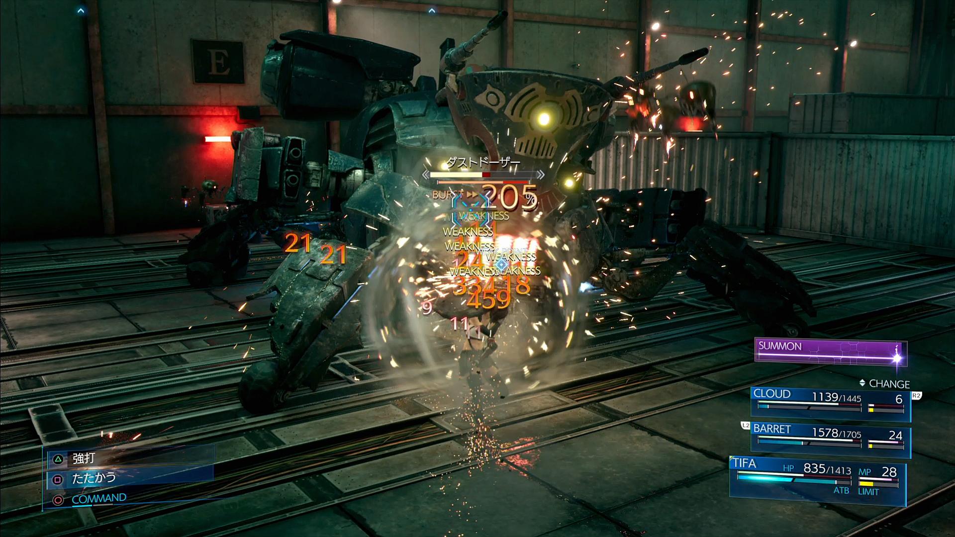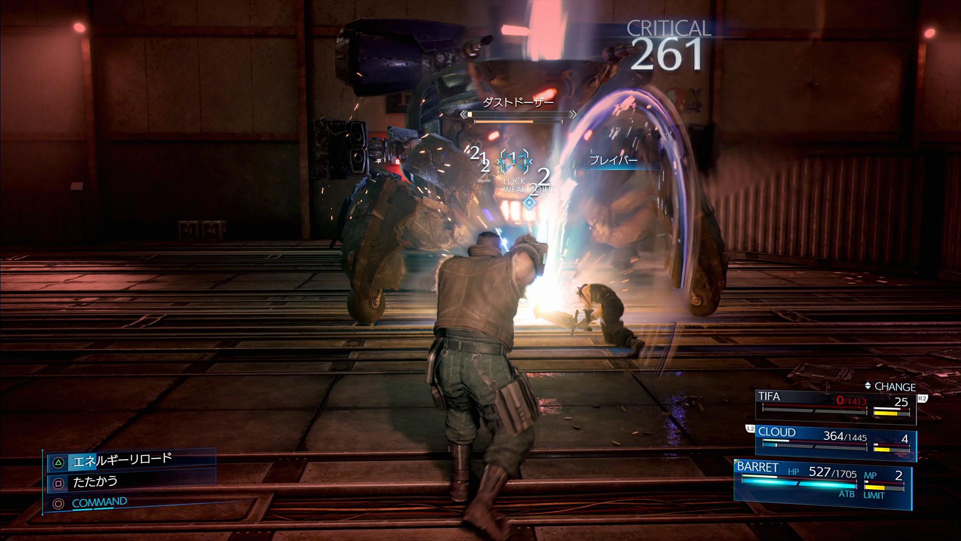 破壊時に約半分のバーストゲージが増える。そのHPは「本体の最大HPの6%」と決まっており、本体よりもやや防御力が低い(ハードでは、足と左右砲台は魔法攻撃を半減し、前足2つは更に物理攻撃も半減するようになる)。というわけで、足を2個破壊すれば敵をバーストできる。なお、敵には、足の破壊とは別に「本体のHPが9%減ると、10秒間ヒート状態になる」という性質もあるため、これもバーストに利用していきたい。そしてバーストできれば、あとは正面のコアを、ティファの「『秘技解放』からの△ボタン攻撃」で殴っていけば良い。そうか、ティファのATB技って、「正拳突き」くらいしか使えるのが無いと思っていたけど、「秘技解放」で溜めての攻撃がその代わりだったのか。ちなみに、バレットの銃撃やクラウドの技は、弱点以外に吸われてしまうことがあり、ダメージ源とするには少し不安がある。そうして、全員のATBバーが満タンの状態で、次の段階へと移行させる。