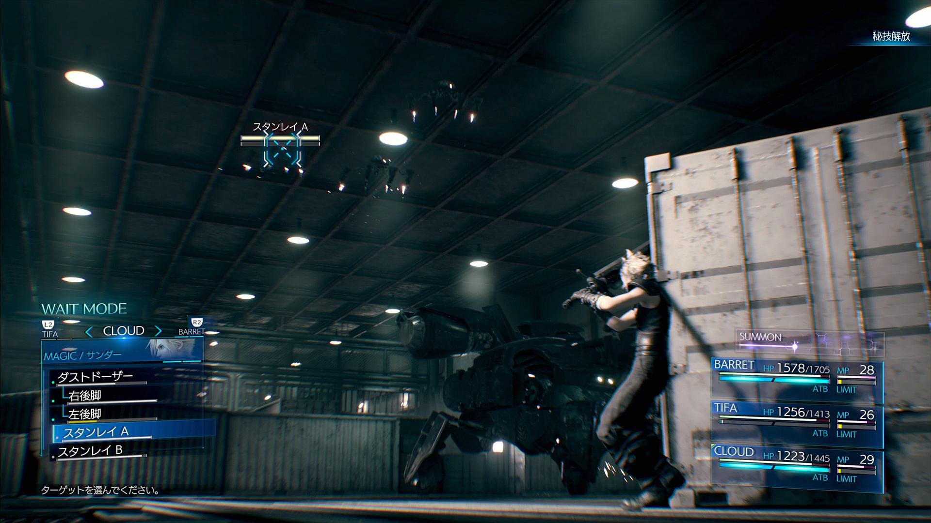 ライトニングさんばりにクラウドさんが大剣を持ったまま電車に乗り込んで、検問に引っかかるところからである。ここでは、雑魚としてスタンレイが合計5体登場するため、まずはクラウド1人でそれを倒さなければならない。なお、ここでは3分の時間制限が課されるが、時間制限が過ぎるとバトルが強制終了して経験値が回避可能…ということは無く、「この3分間で『敵を倒して扉を開けるまでの手順』ができるかどうかで、その後の展開が少し変化する」という内容になっている。一応は最低戦力のはずの本プレイであっても、敵の殲滅に1分もあれば十分であるため、何ら問題は無い。