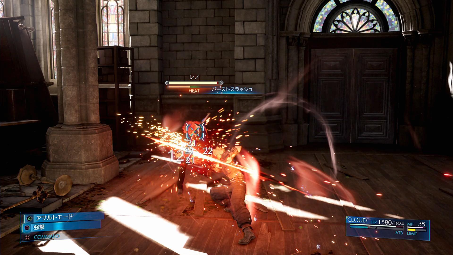 それでは、8章を攻略していくことにしよう。開幕では、教会にて、クラウド1人で「レノ(1回目)」と戦うことになる。このバトルは、これまでとは全く異なる性質の戦いとなり、私も初回プレイの時はかなりの苦戦を強いられたものであった。ただし、本プレイにおいては、短期決戦となるため、「戦闘中の回復禁止」が難化要素とならず、難易度は低めである。