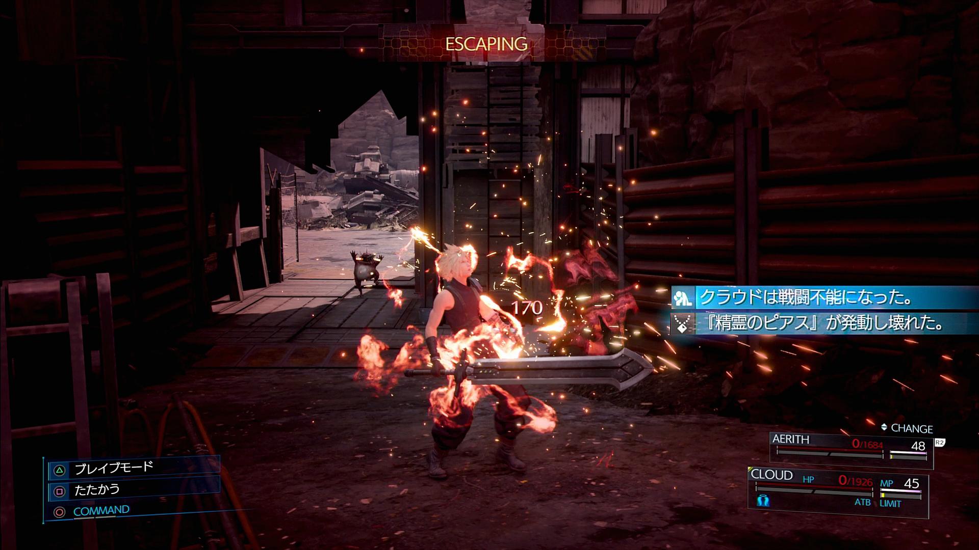 …さて、こいつは、ボタン連打では決して勝つことのできない相手である。その理由は、漫然と攻撃しても大半が回避されてしまい、全くATBゲージを補給できない。また、攻撃の威力が高く、メンバーもクラウド1人しか居ないため、受けたダメージの回復が追いつかないからである。