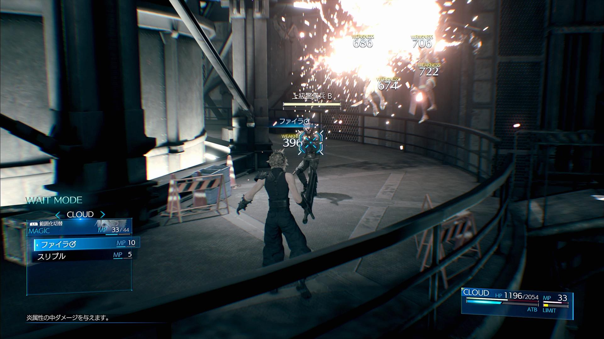 経験値602 … クラウド1人でのバトルであり、鉄骨の障害物に阻まれる。戦闘は、引き付けた後に、範囲化した「ファイラ」で片付ければ良い。なお、Bのパーティには「マシンガン」も存在するが、こいつは追尾してこないため、倒さなくとも先に進められる。