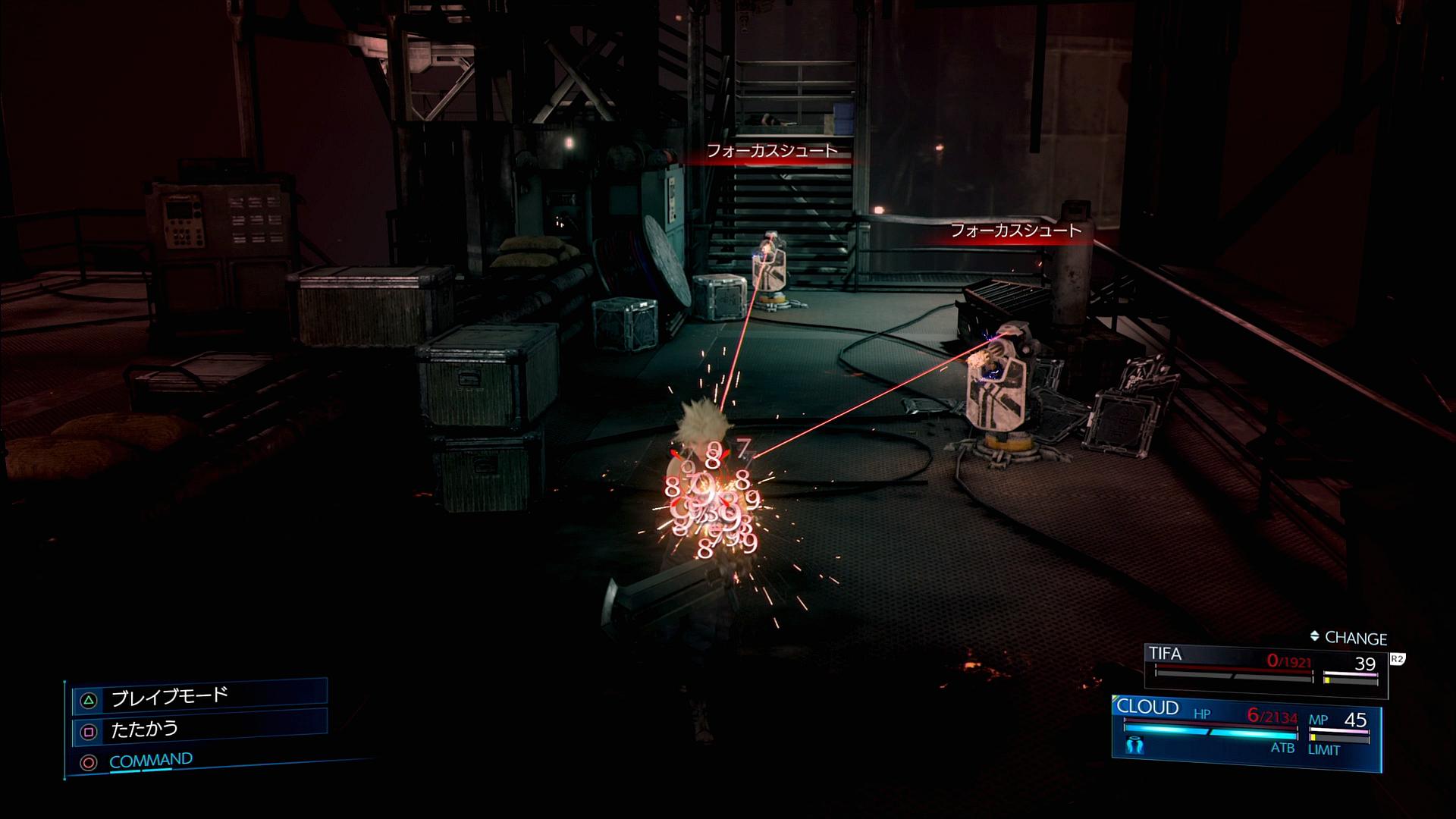 そうして、バトルが第2段階に移行する。まず、ルードによる爆撃は、位置が決まっているので、そこから離れれば良い。ちょうどレノが柵の向こうに隠れているので、そこに近付いていくと良いだろう。とクラウドを移動させていると、味方が棒立ちで爆撃を喰らって悲しい気持ちになったりもしたが。