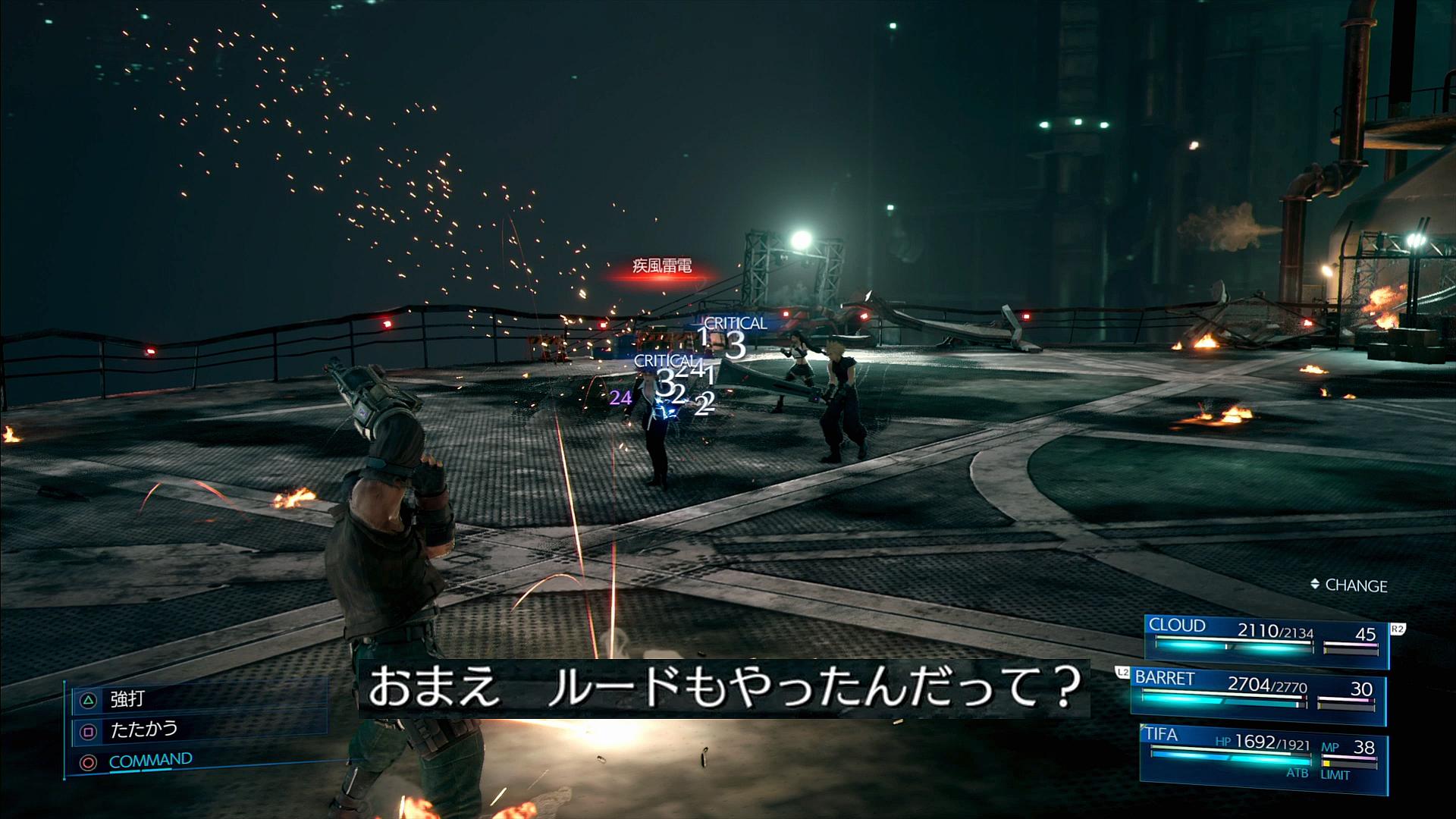 ――ちなみに、第3段階のルードについては、レノと2人で激しい攻撃を加えてくるが、8章と比べるとガード不能の投げ技が減っており、多少なりとも戦いやすい相手となっているようだ。風属性を弱点としており、連発するとヒート状態にできるのも同じである。ただし、エアリスの「聖なる魔法陣」が無いため、”風属性魔法を連発する”というのは少しだけ難しいという状況になっている。