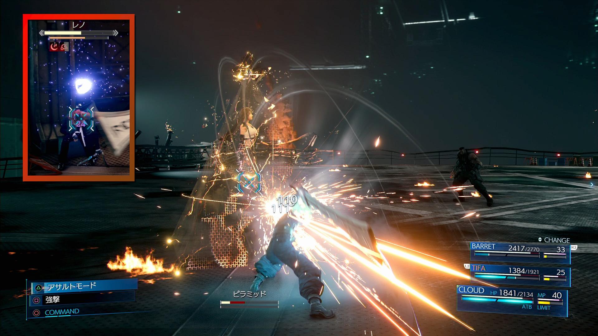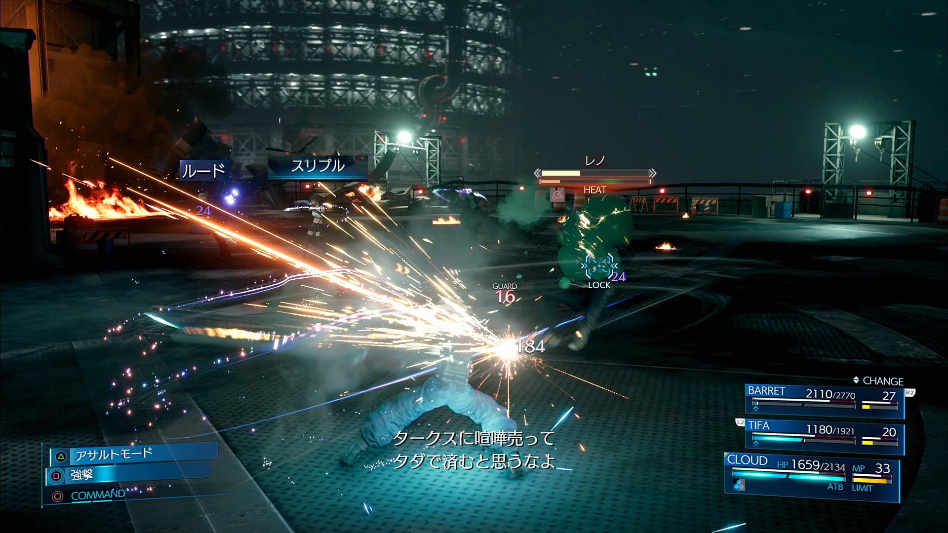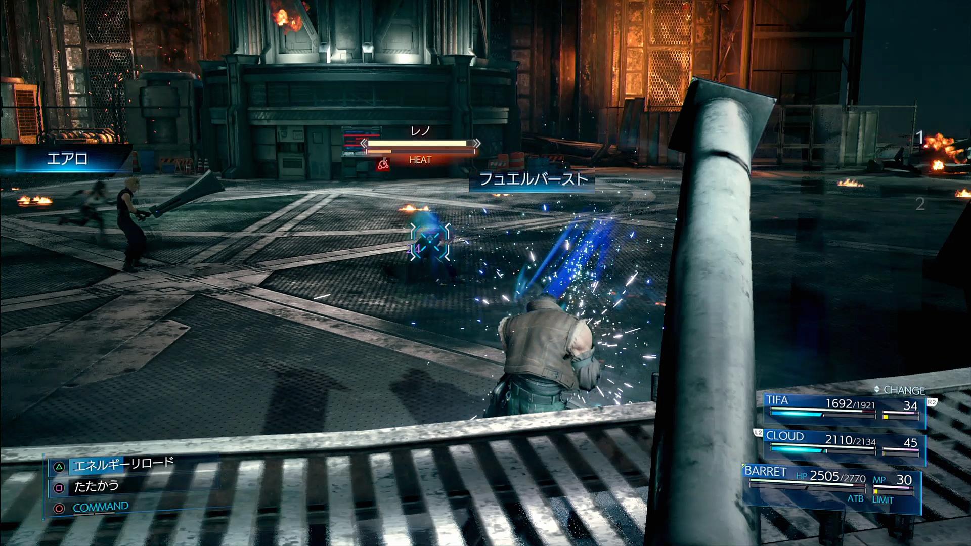 …なお、少しややこしいが、「段階」の区切りはレノを基準とし、「第1段階:レノHP100〜65%」「第2段階:レノHP64〜40%と、ヘリコプターを撃墜するまで」「第3段階:レノHP40%以下と、ルードHP51%以下」とする。バトルもこの段階で区切られてムービーが入る(第2段階は、ヘリコプター前で区切られない)ため、この区分けが体感的で分かりやすいはずだ。