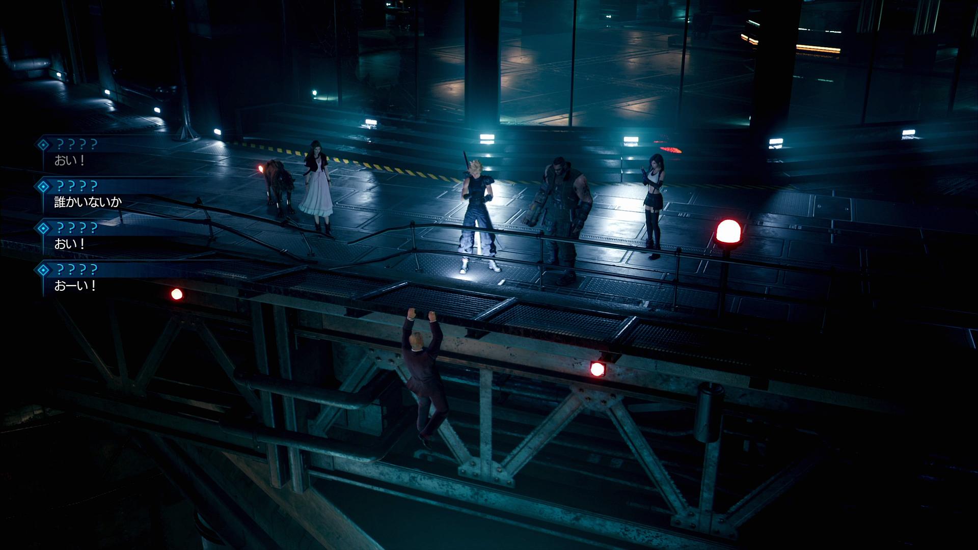 …その後は、何故かぶら下がっている神羅社長に近づくと、イベントが進んでいく。ちなみに、オリジナル版FF7でのプレジデント神羅は、タークスに捕まっての会話イベント後、社長室を再訪すると勝手に死んでいる。ということで、懸垂をしている社長はリメイク版オリジナルということになるのだが、何故こんなことになっているかについての説明は一切存在しない。状況から判断するに、原作と同じくセフィロス(ジェノバ)がやったのであると思われるが、社長室から思いっきり吹き飛ばされてガラスを割った挙げ句、その勢いで手すりまで破壊している。