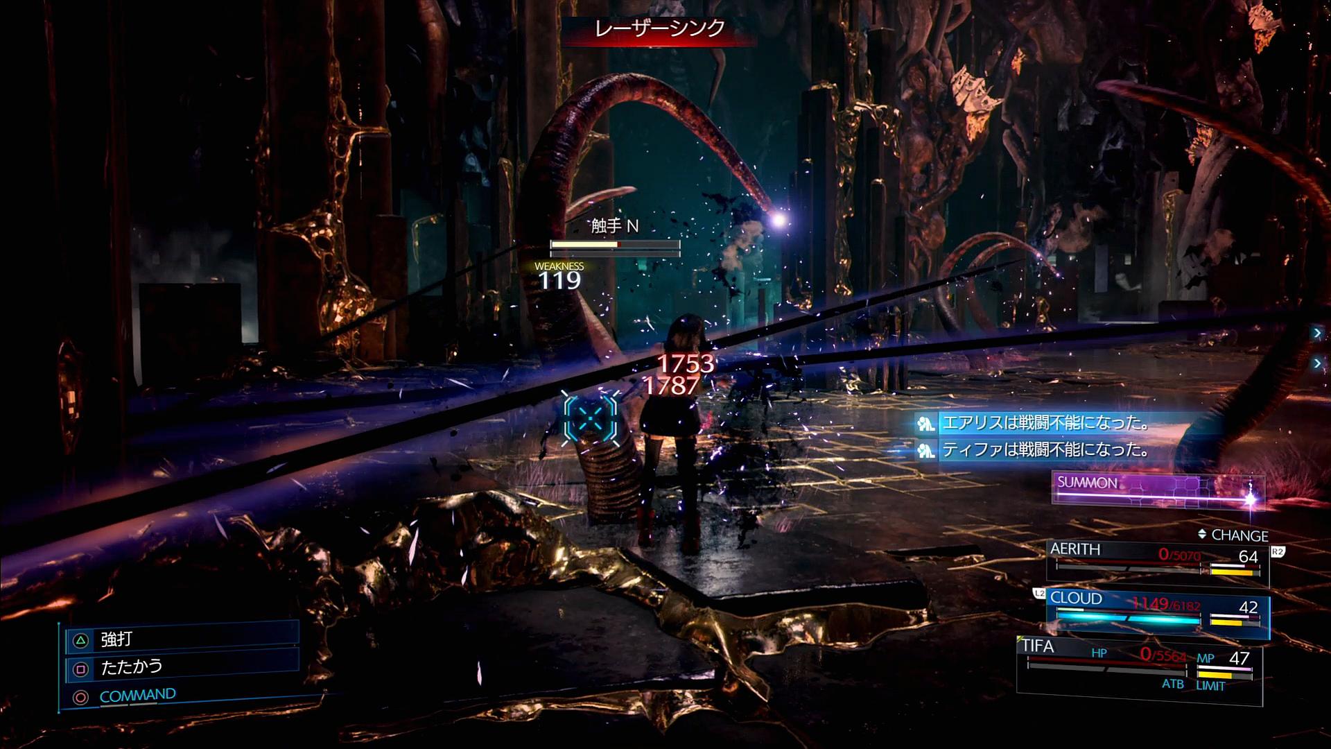 さて。肝心の触手の耐久力であるが、HPは3桁であり、「物理ダメージ2倍」「魔法標準&全属性ダメージ2倍」という特性があるため、エアリスの「サンダー」・ティファの「正拳突き」・クラウドの「ブレイバー」で、どれも確実に伐採が可能である。