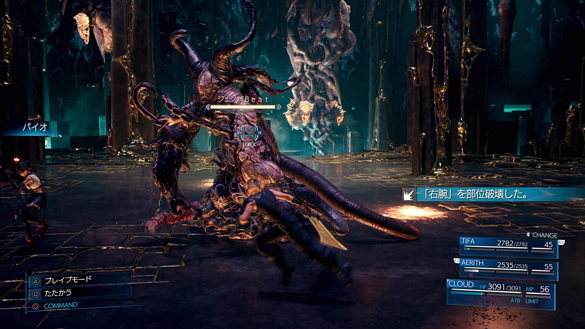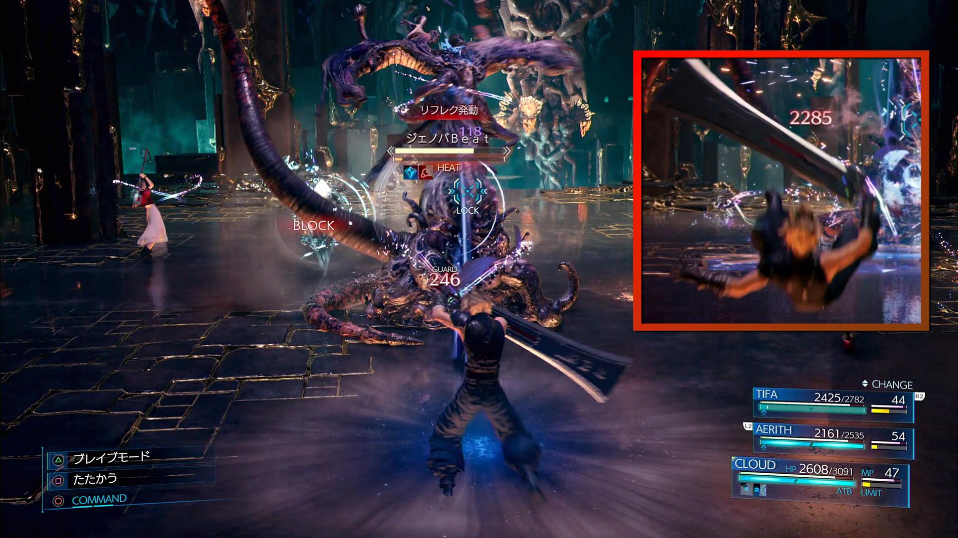 それでは、こいついつも懸垂してんなという感じのプレジデントに近付き、最初のボスである「ジェノバBeat」と戦っていこう。原作には無かった完全オリジナルのジェノバであり、「Birth(誕生)」よりも前の「Beat(胎動)」を表しているようだ。なお、原作風に表記すると「ジェノバ・BEAT」となるが、リメイク版でのジェノバは「ジェノバBeat」のように表記していくのだろう。
