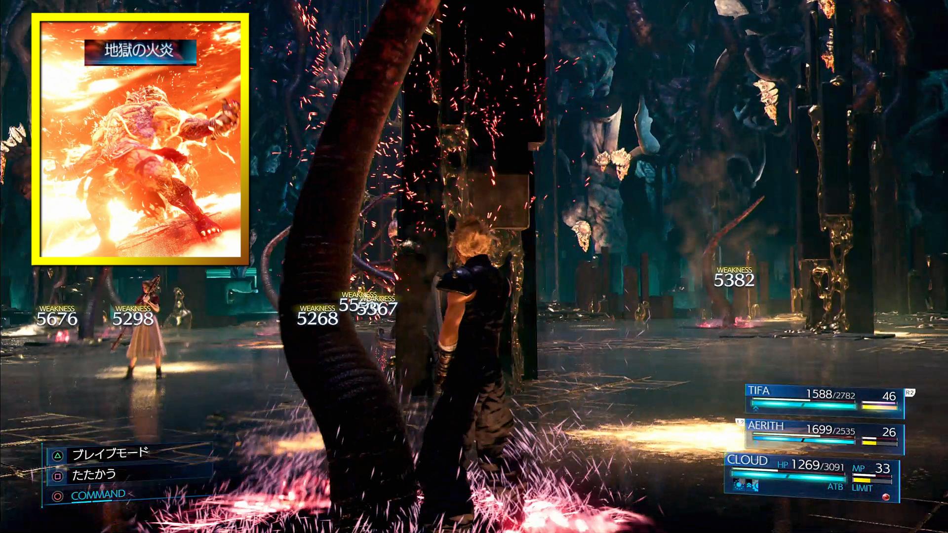 …ということで、実戦では、第3段階開始後に最速タイミングで召喚獣を使い、あとはジェノバレーザーを喰らう前に3本・6本の触手を収穫するよう心がけていったところ、無事に触手12本のパートでイフリートの「地獄の火炎」が発動してくれた。触手12本が出現した後は、人間キャラで積極的に攻める必要は無く、ATBゲージを補充して「レジスト♂」や「ヘイスト」を貼り直す時間すらあったほどである。