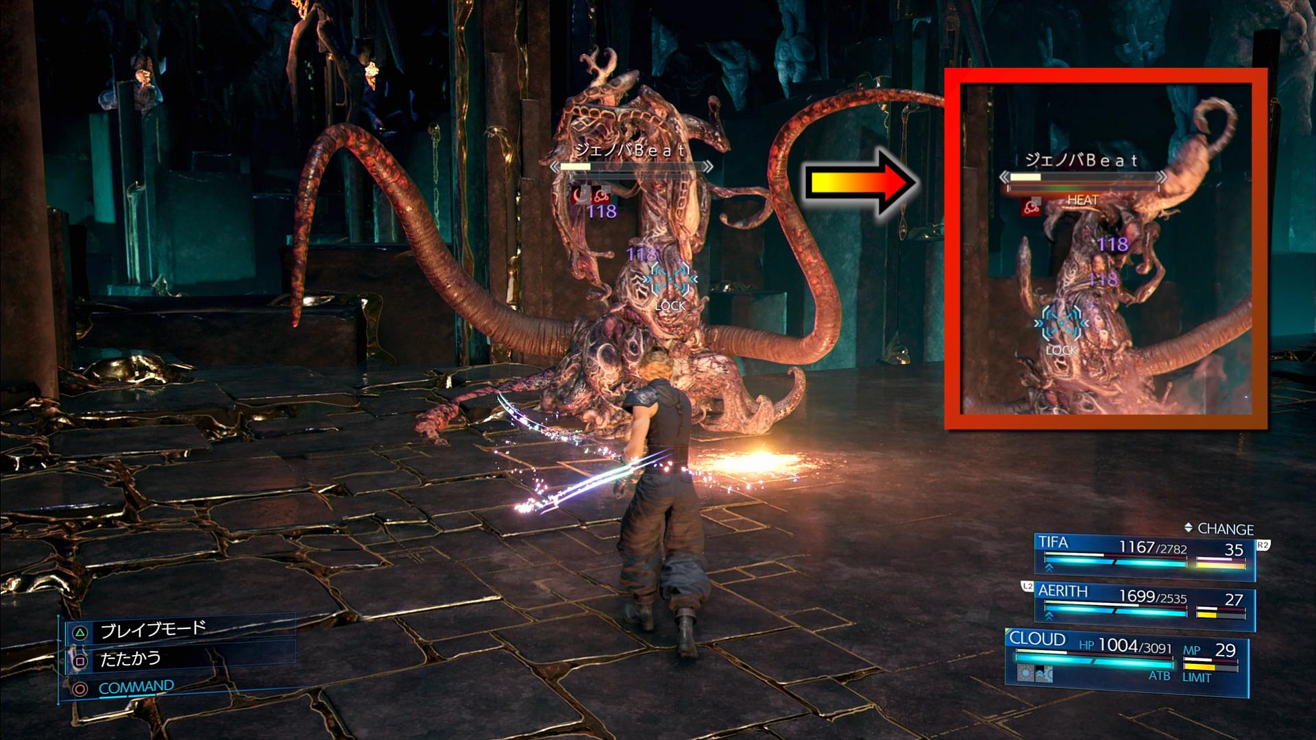 …まず、ヒートしていない時の敵は、第1段階と変わらないため、エアリスが魔法で腕を破壊し、その方向からクラウドとティファが近接攻撃で削っていけば良い。途中、味方側のレジストやヘイストが切れた場合は、隙を見て掛け直していく。