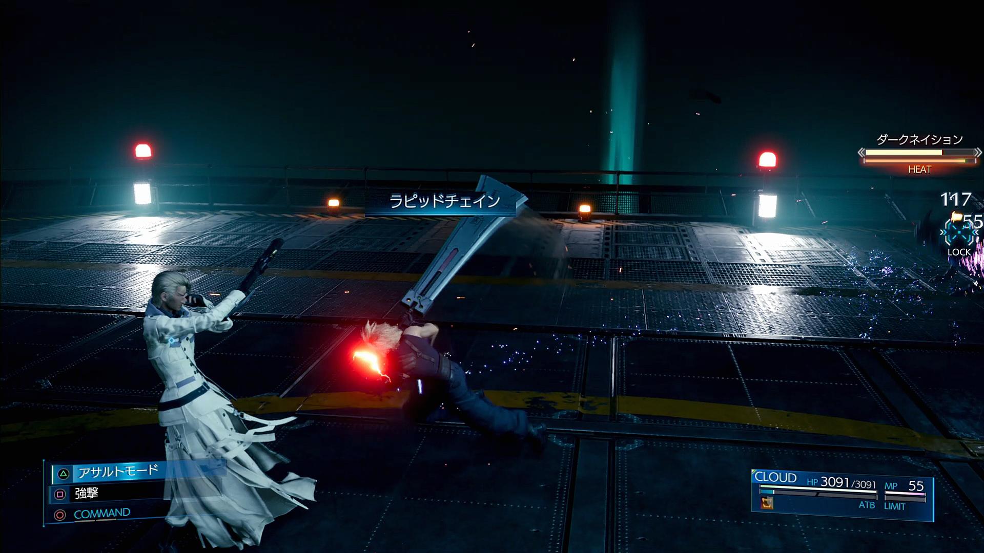 ――ただし、この際、ただダークネイションを攻撃しているだけだと、起き上がったルーファウスから銃撃されてダメージを受けてしまう。それでも、ボタン連打をしていれば、銃撃の合間にダークネイションを攻撃できるのだが、ノーダメージ攻略ではそうもいかない。ということで、適当なタイミングで「ラピッドチェイン」を使用し、再びルーファウスを弾き飛ばして、攻撃時間を作る。