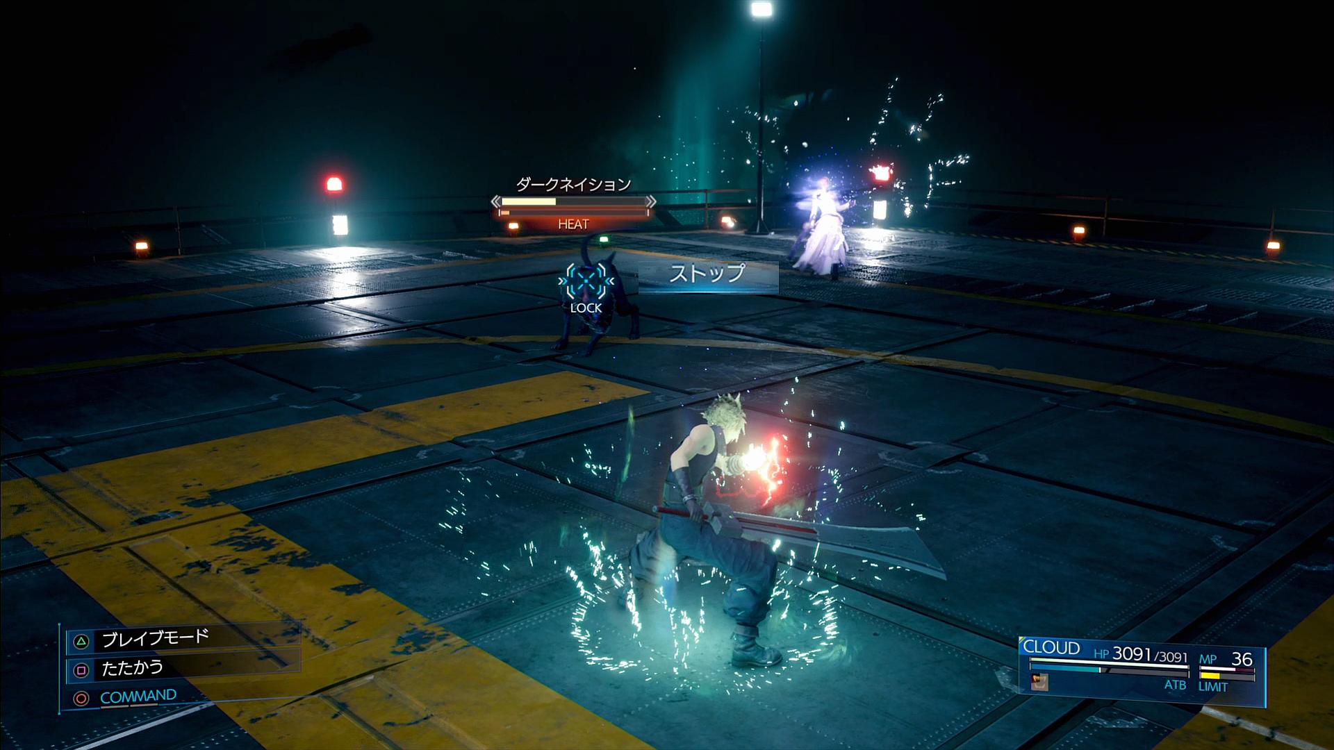 ○ダークネイションを攻撃し、第1段階を終了させる。ルーファウスが起き上がってこちらに向かってくるが、ほとんどの場合はムービーが入って中断される。攻撃の最後のほうで□ボタン長押しをし、バーサク状態を延長しておくこと