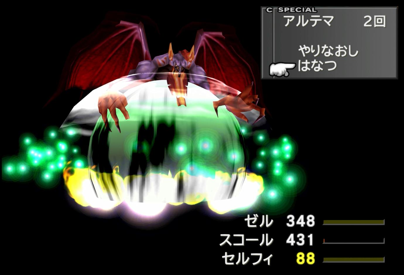 さて。実戦では、セルフィは最初から低HPにして挑むことにした。どれくらい低HPにするかは難しいところであり、どうせ失敗するときは失敗するのだが、実戦では「88」という数値を選んでいった。HP18.3%で特殊技発動可能(無ST異常&戦死者0なら32%から)であり、かつ、ビッグスの「サンダー」で一撃死しない程度である。しかも、FF8ということで、8が二つ並んでいて縁起が良い(最大の理由)。