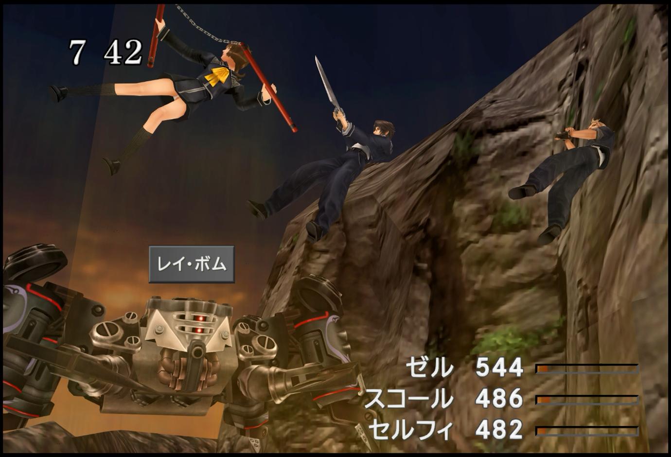 …ちなみに、ビッグスのHPであるが、味方の平均レベルによって変動し、かつ、上振れするか下振れするかがランダムで決まる。具体的には、味方が全員初期レベル(スコール7、ゼル8、セルフィ8)を前提とし、ビッグスのHPは「Lv6/582」「Lv8/640」のどちらかとなる。このレベルを戦闘中に判別する方法は、ジャンクションなしだと、「敵の攻撃を受けてみて、そのダメージの大小で判断する」などと、不明瞭にならざるを得ない。やれ、敵の強さが味方の平均レベルによって決まるだけでなく、そこから更にランダム変動するという仕様は、雑魚戦においては遊びの幅を広げてくれていると言えるが、ボス戦の仕様としては、あまり好ましくないように感じる。