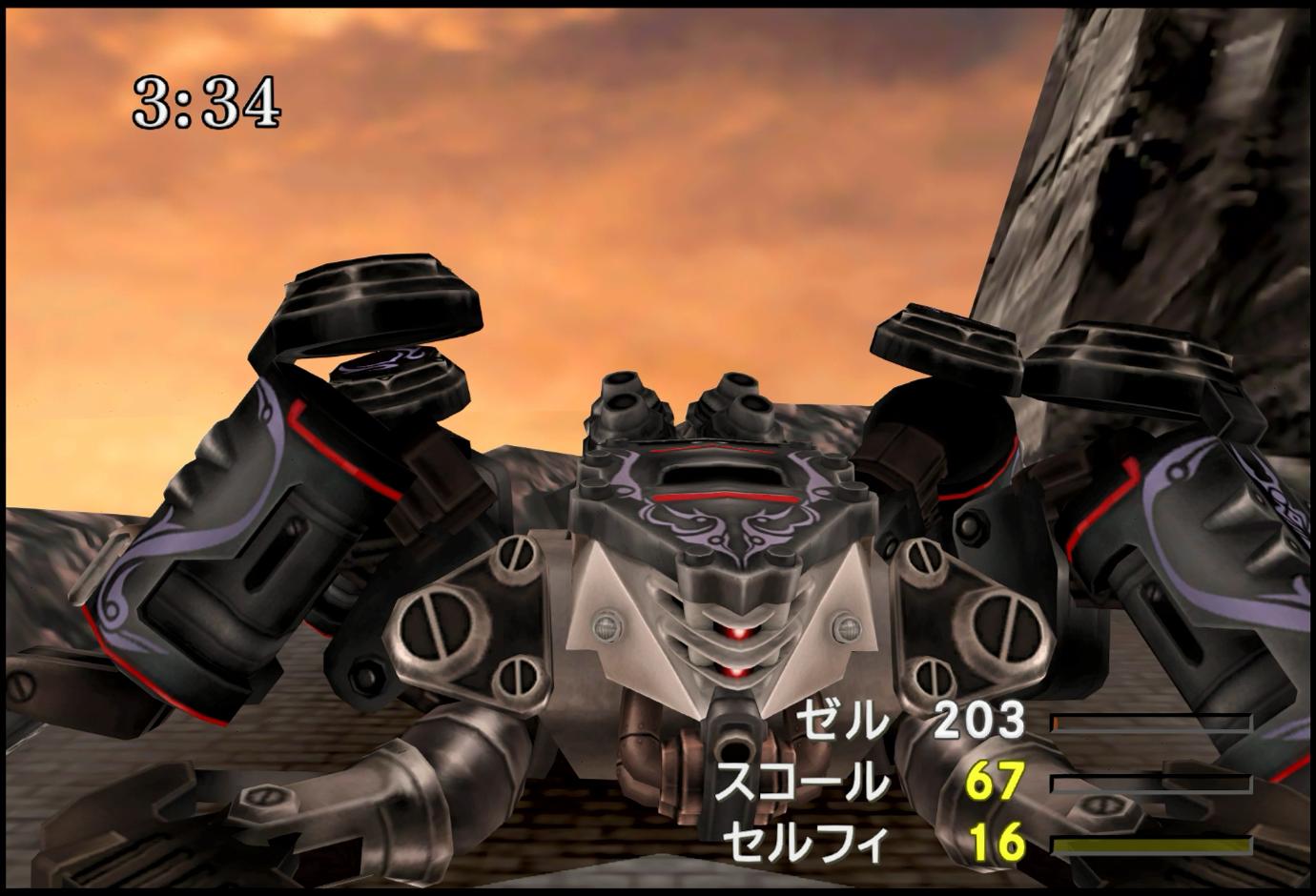 ちなみに。今回は、「ジャンクションなしで敵を破壊まで持っていく」というチャレンジも行ってみた。方法はシンプルで、まず1回目は普通に転倒させ、その後は「敵の転倒中に、スロットで高威力の魔法を予約しておき、修理完了直後に即転倒させる」ということを狙っていく。敵は、エルヴィオレほど精神が高くはなく、雷属性への1.5倍弱点を持っている。そのため、「メテオ」「アルテマ」はもちろん、「サンダガ」でも約600ダメージを与えられ、2回以上ならば転倒へと持っていける。スコールとゼルの特殊技を自動にして時間を稼ぎ(ゼルは専用コマンド枠が表示されるため意味が無かったが…)、割と簡単に、修理不可の状態(故障カウンターが「5」の状態)にまで持ち込むことができた。