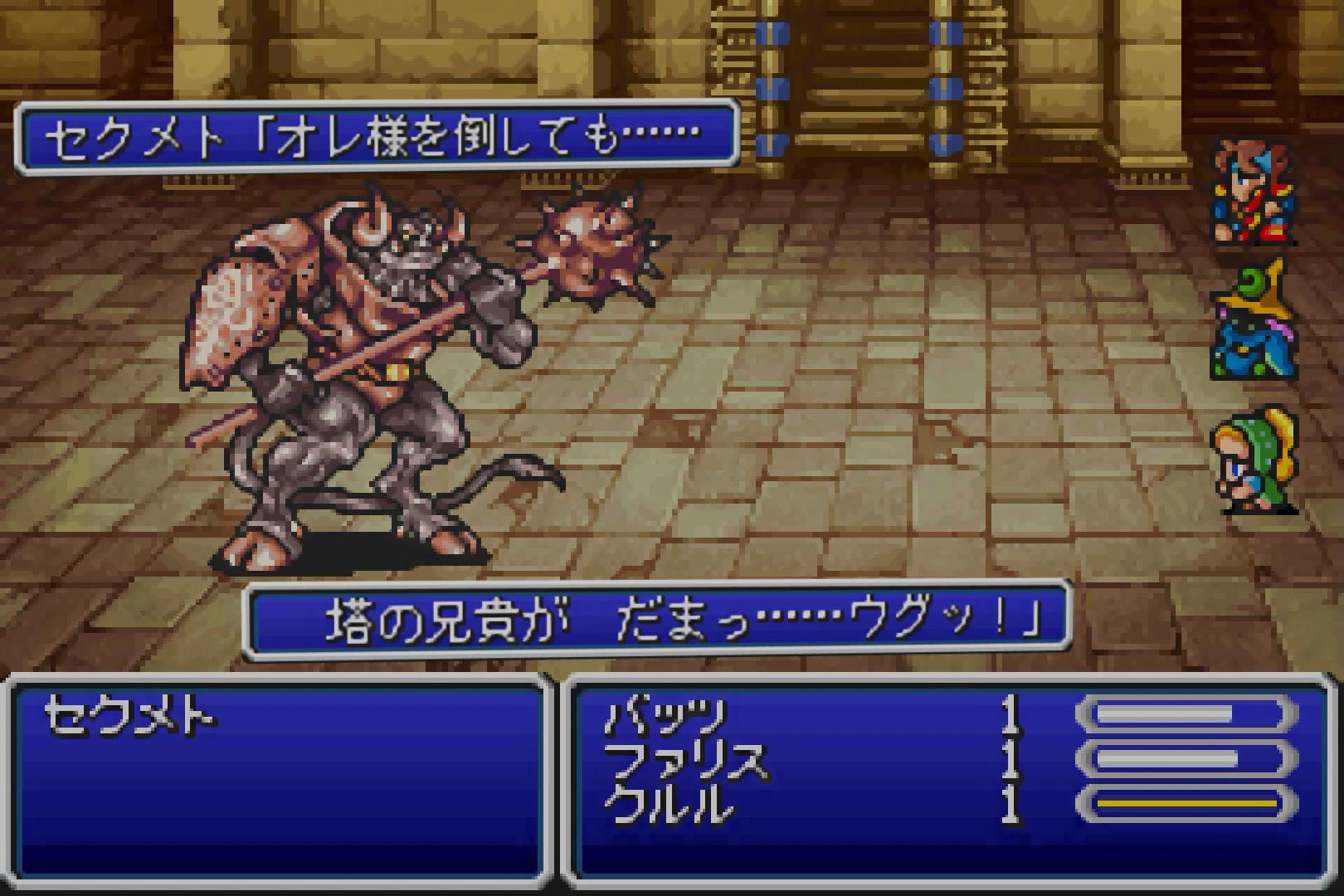 意外にも、兄→弟と倒した扱いになり、終了時のセリフをセクレトのほうが担当する。しかしながら、私が実験プレイで、セルフィの「メテオ×3」を使って兄弟を同時撃破した際は、ミノタウロスが最後まで残っていた扱いとなった。たぶん、メテオ1回目、2回目、3回目、またはそれらの間の区切りのどこかで、先にセクレトがHP0となり、その後にミノタウロスのほうもHP0になったからであろう。つまり、この考えを使うと、アデルとリノアを同時にHP0にしても、リノア撃破でゲームオーバーになることも可能ということだ。どれだけリノア殺害にこだわっているんだ私は…。