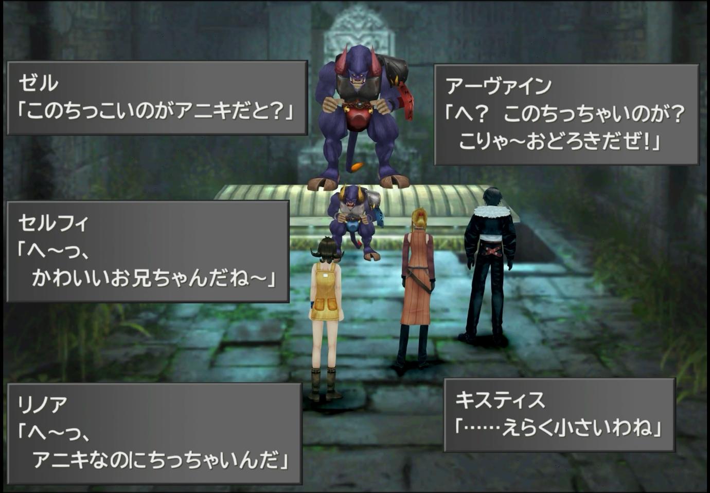 (MAPで一番後ろを付いてくるキャラ)」が、“兄なのにミノタウロスのほうが小さいこと”に対して、感想を述べる。ちなみに、FF8のメインキャラには、一切の兄弟姉妹のいる描写が無い(スコールがエルオーネを姉のように慕っているだけ)のだが、その辺りと絡めた演出は特に無いようだ。