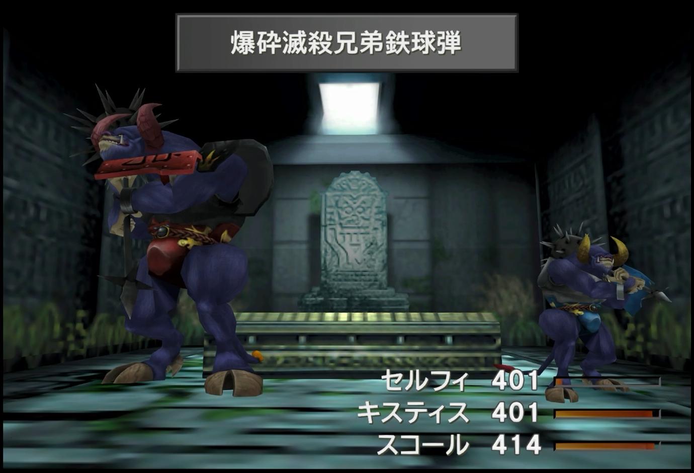 「爆砕滅殺兄弟鉄球弾」だ。この名前で地属性の魔法攻撃というのが驚きだが、それはそうと、低レベルを前提として全体に300弱のダメージと、なかなか痛い。威力数値は「32」であり、ガ系魔法が「35」なので、それが全体に降ってくるようなものだ。DISC1だと、ラストのイデアが「サンダガ」などを使ってくるだけで十分なインパクトだったため、かなり痛い技と言える。どうやら正比例ではないようだが、トルネドの「38」や、クエイクの「40」といった威力数値も参考になるだろう。