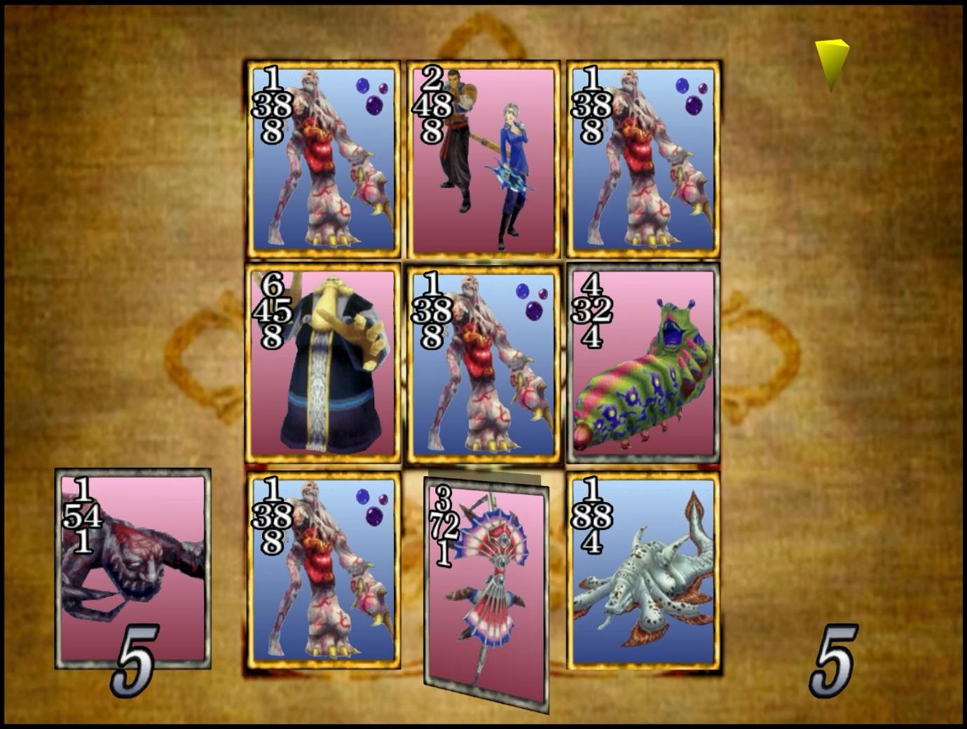 モルボル×4枚を使って左下から埋めていき、最後に上下タイプのキスティスで1枚だけ裏返すという戦法で戦っていった。これで、コマンドミスを除けば、負けは絶対に無くなる。ネタではなく、普通に有用なテクニックだ。しかしながら、今回は、敵の使用するボスカードに「8」の目があるため、同じ戦法は使えない。さて、どうしたものか…。