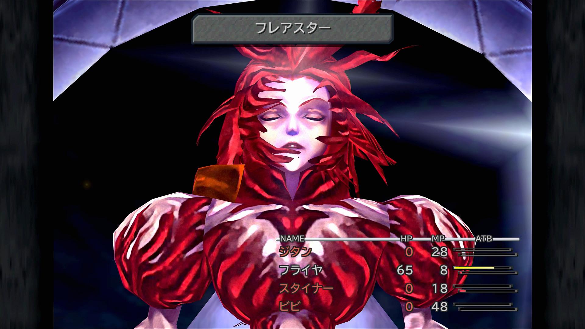 …まあ、勝ち方として、明確なパターンみたいなものは無いのだが、高火力キャラクターのジタン・フライヤ・スタイナーができる限り「フレア」「ホーリー」で狙われない、つまりビビが盾になってくれると嬉しい。また、「フレアスター」については、1回でも回避すれば、大きく勝利に近づいてくれる。
