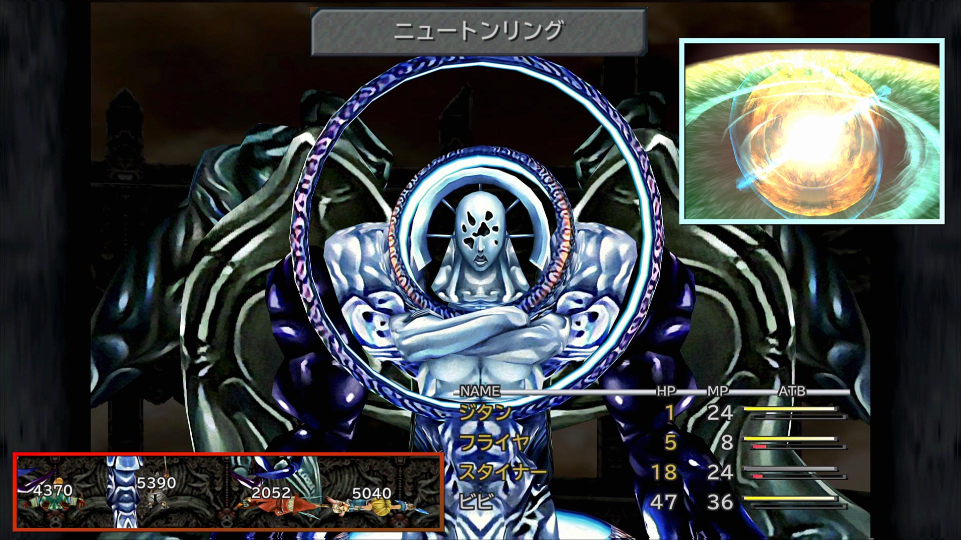 さて。話をFF9の縛りプレイに戻そう。「ニュートンリング」は、単純な高威力の無属性・全体物理攻撃である。FF9のシステム上、全体物理攻撃を回避することはできない。そのダメージは、標準的な防具を装備して、前列キャラで2000〜4000というところである。